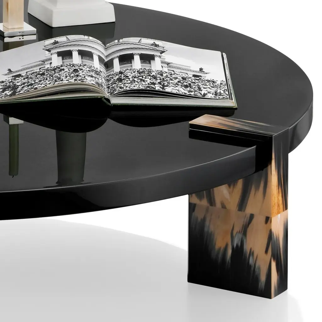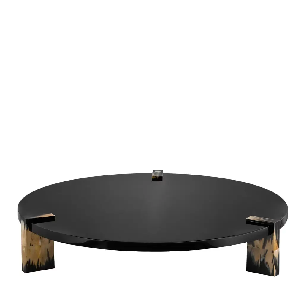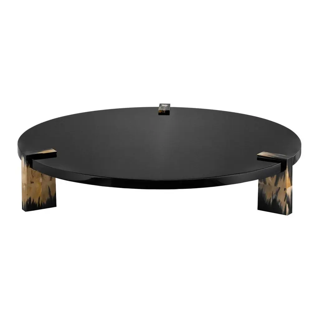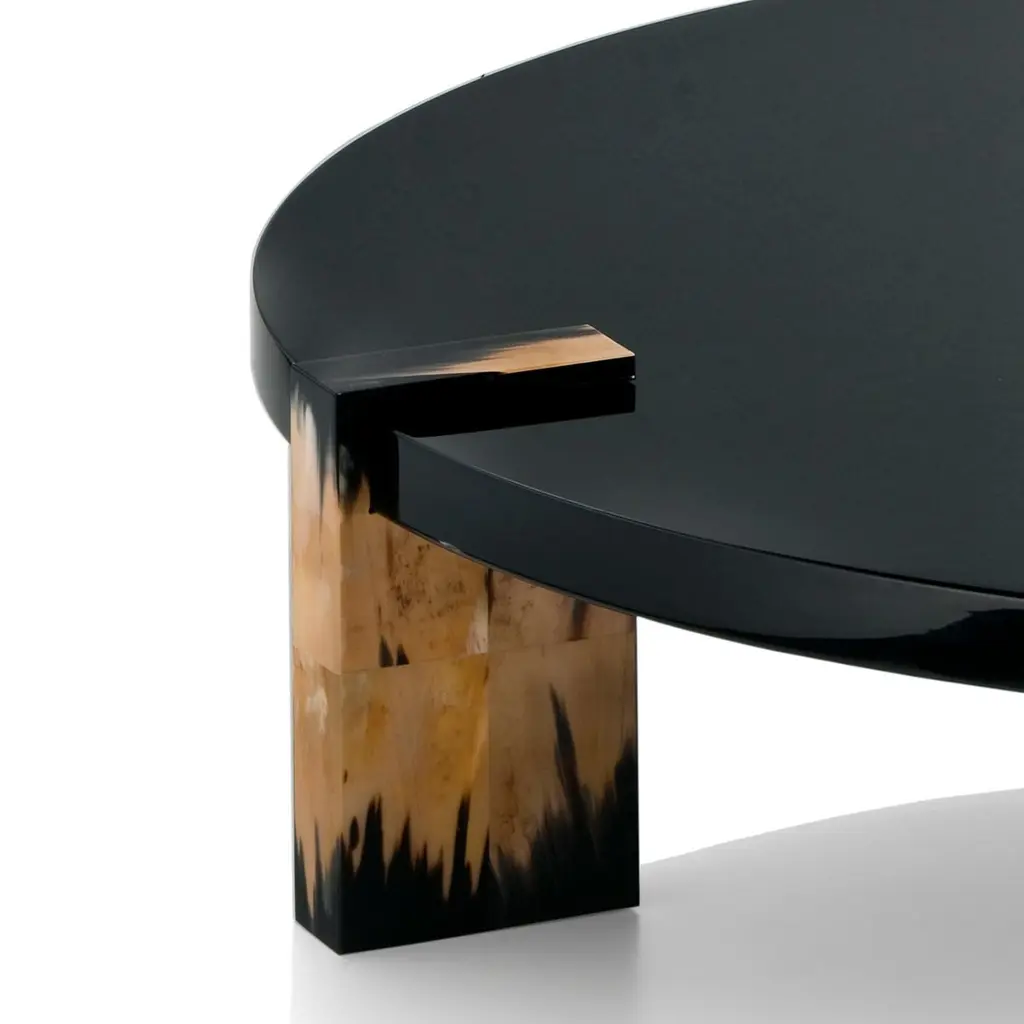 Featuring a round tabletop in wood with lacquered black gloss finish, Paestum coffee table is embellished by three elegant legs in Corno Italiano, whose variegated veining create a striking visual effect drawing attention and attraction to the center of your living space.Note: Colors and shades of Corno Italiano processed by our Company are unique and due to the natural origin of raw material. For this reason Corno Italiano tones that can be seen in pictures are indicative and cannot be reproduced in finished products.