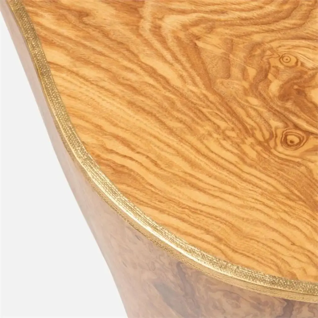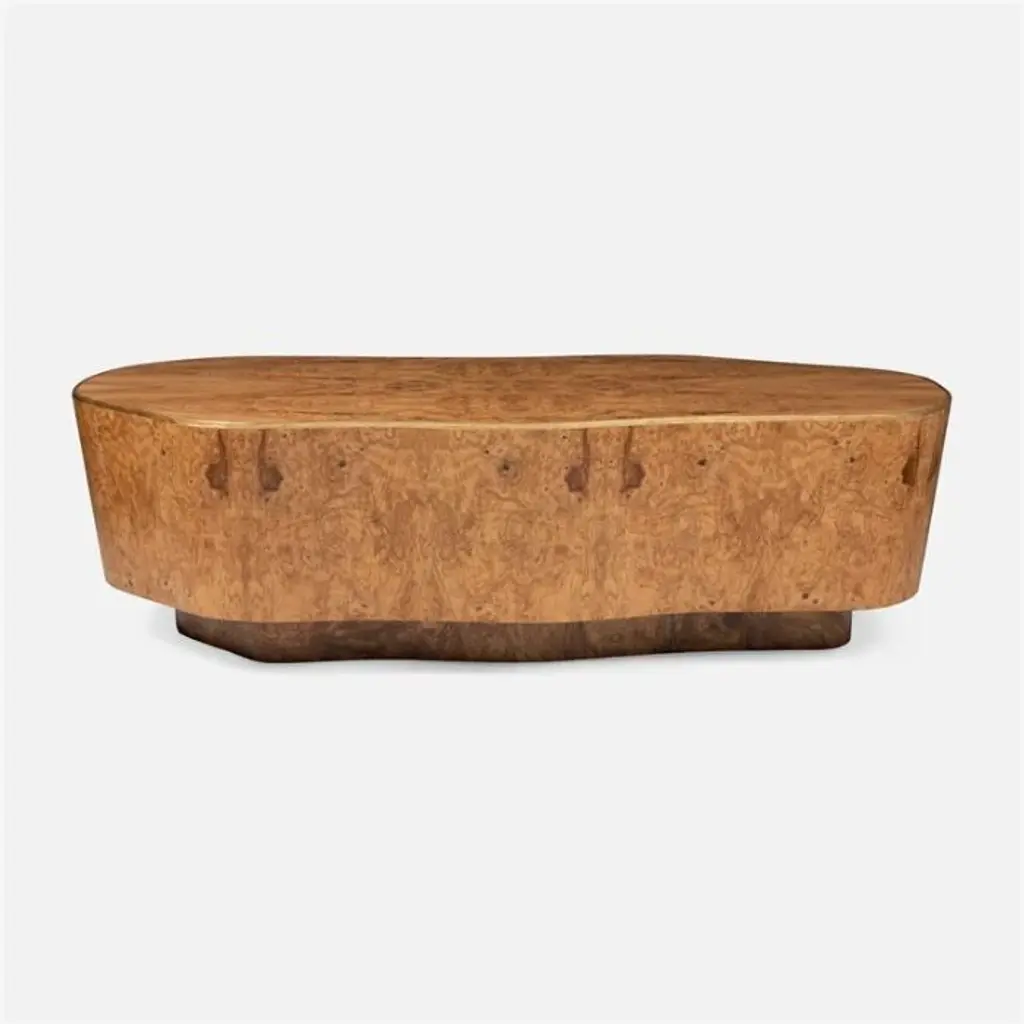 This masterfully designed coffee table boasts an organic shape and olive ash burl wood veneer. The faux raffia gold trim adds a bit of muted glam while highlighting its' unique abstract design.