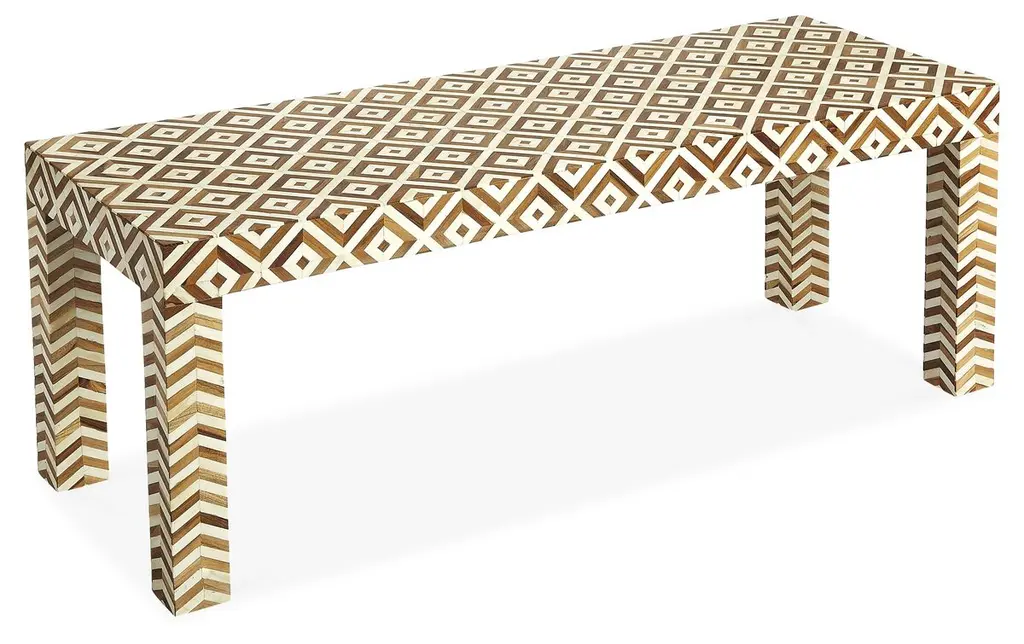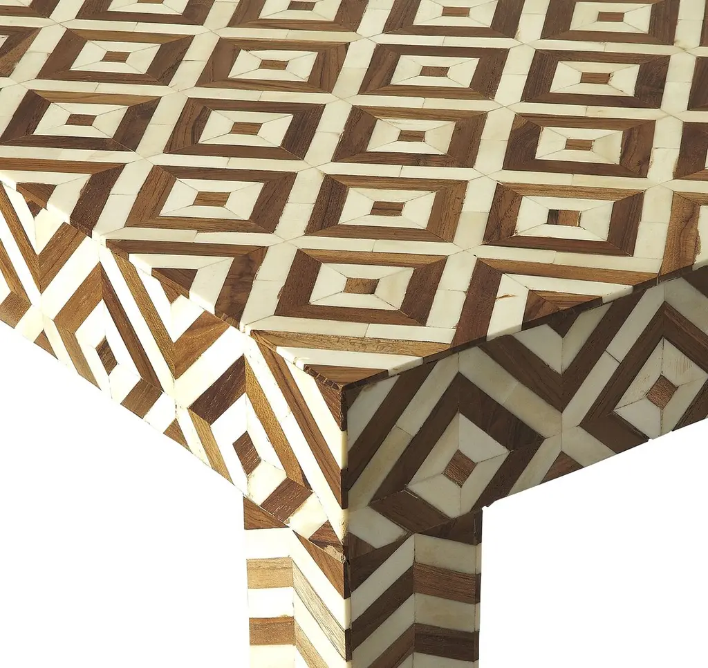 This standout coffee table speaks of centuries-old tradition and craftsmanship. Carved of merranti wood, its clean-lined body is inlaid with hand-cut bone tiles arranged in an impressive geometric repeat. Variations in bone inlay are to be expected, and create unique character in each handcrafted masterpiece.