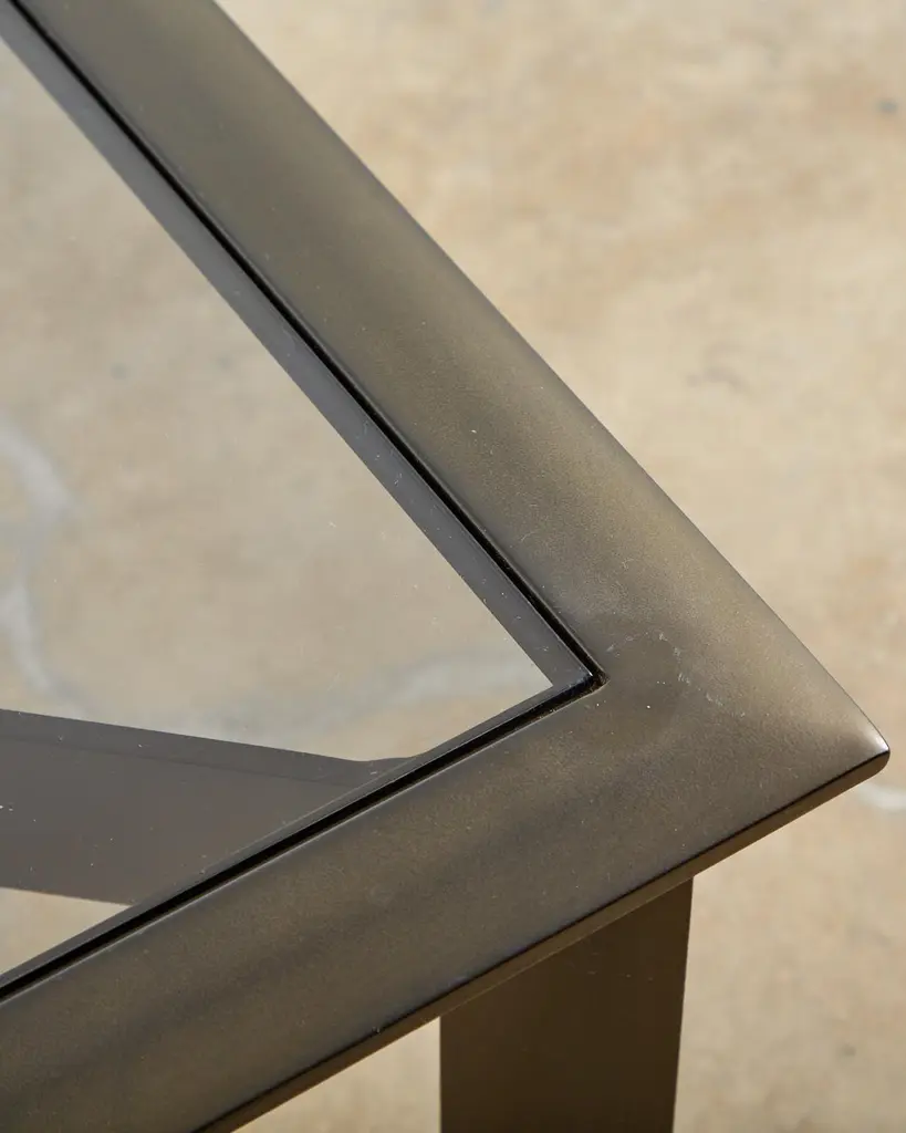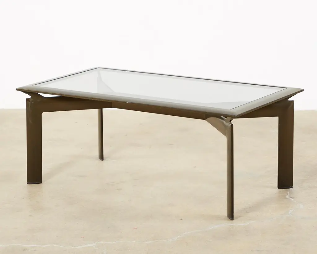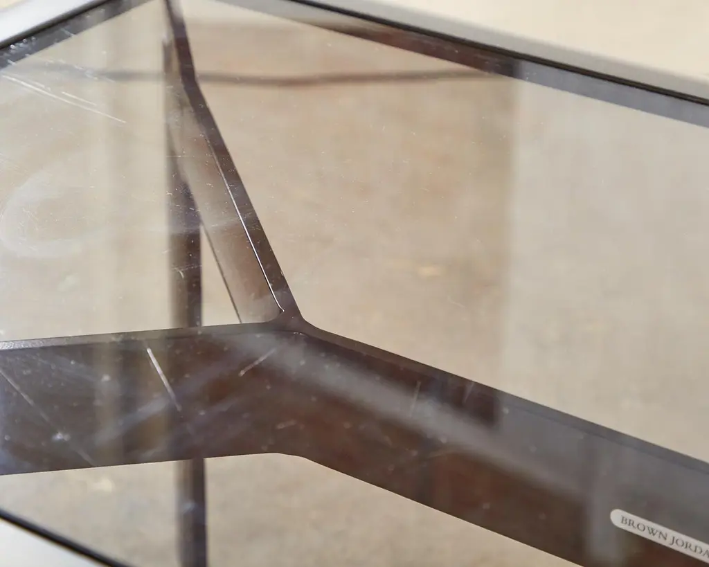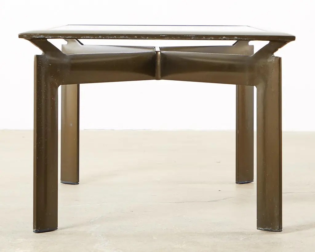 Sleek pair of bronzed aluminum patio and garden cocktail tables designed by John Caldwell for Brown Jordan. The smooth, modern frame is handcrafted with a floating top design and inset with tinted glass. Supported by thick canted legs and powder coated with a rich bronzed finish and patina. Price is for each.
