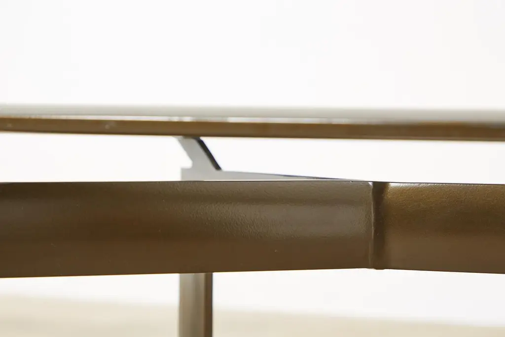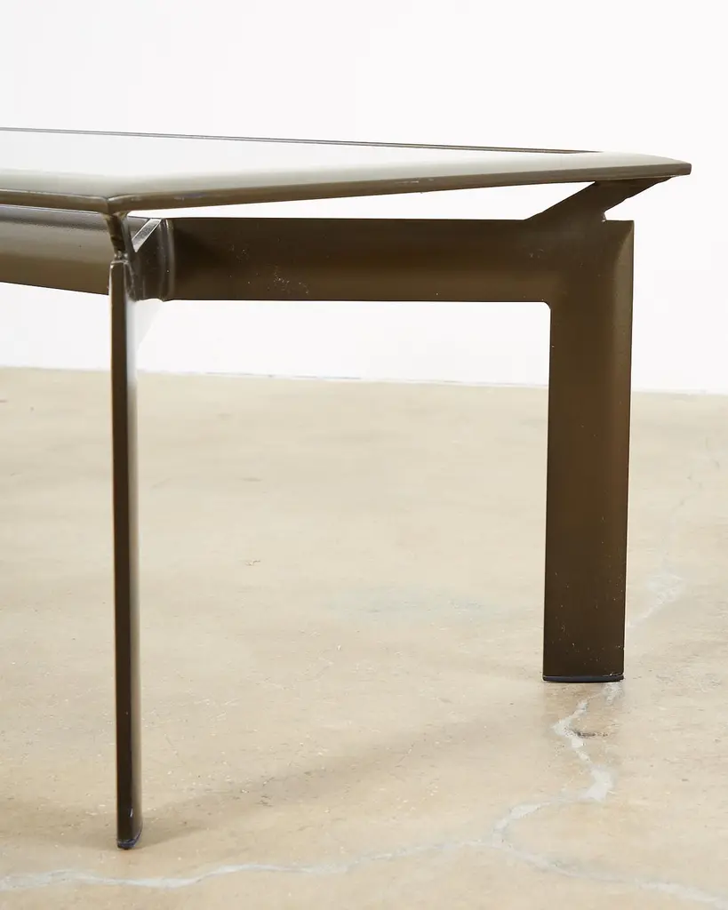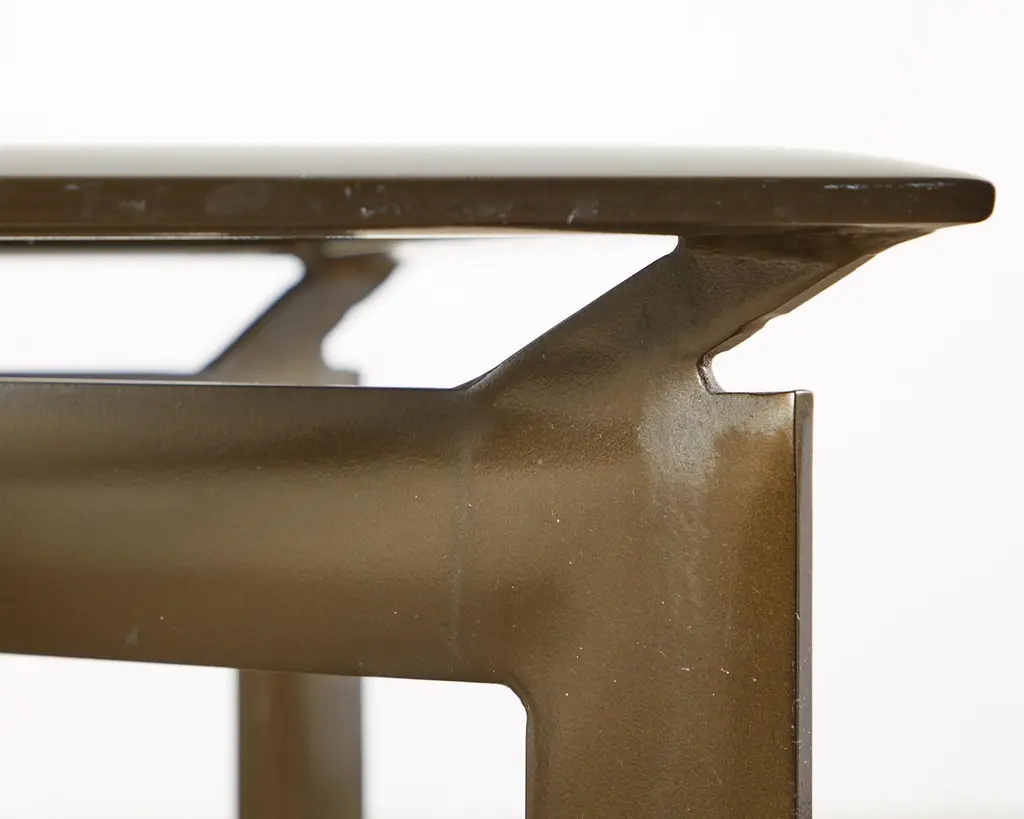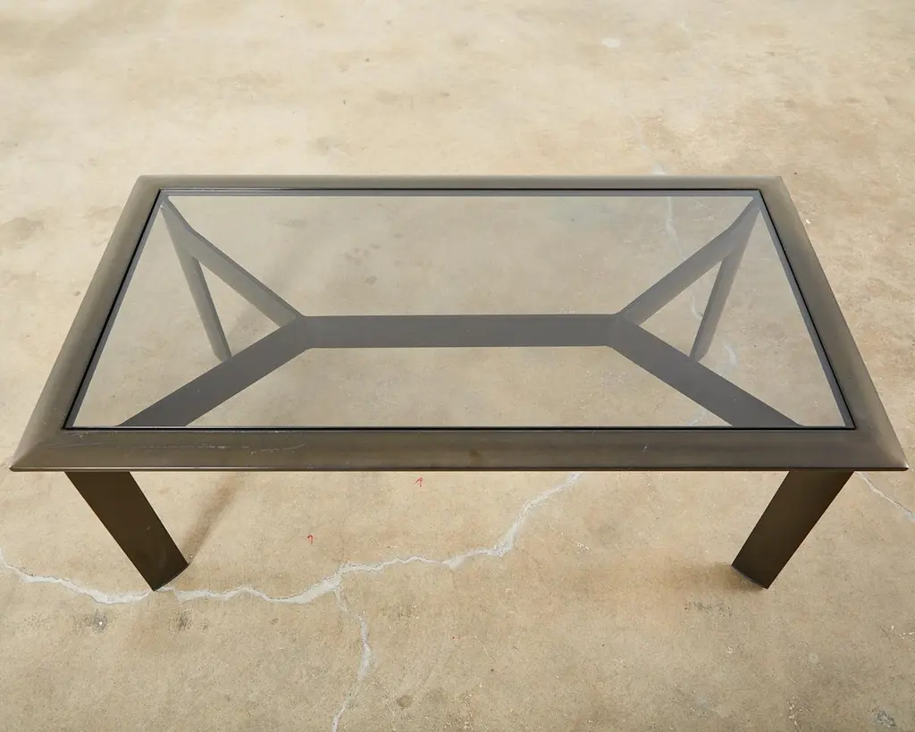 Sleek pair of bronzed aluminum patio and garden cocktail tables designed by John Caldwell for Brown Jordan. The smooth, modern frame is handcrafted with a floating top design and inset with tinted glass. Supported by thick canted legs and powder coated with a rich bronzed finish and patina. Price is for each.