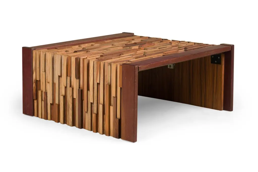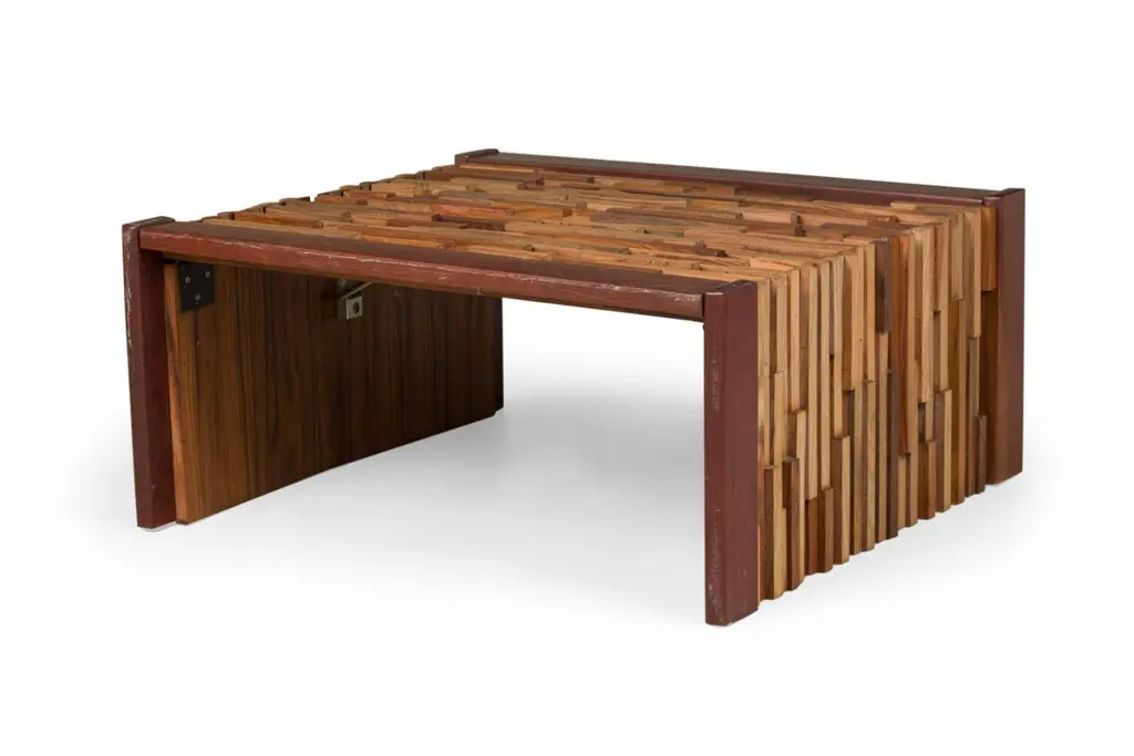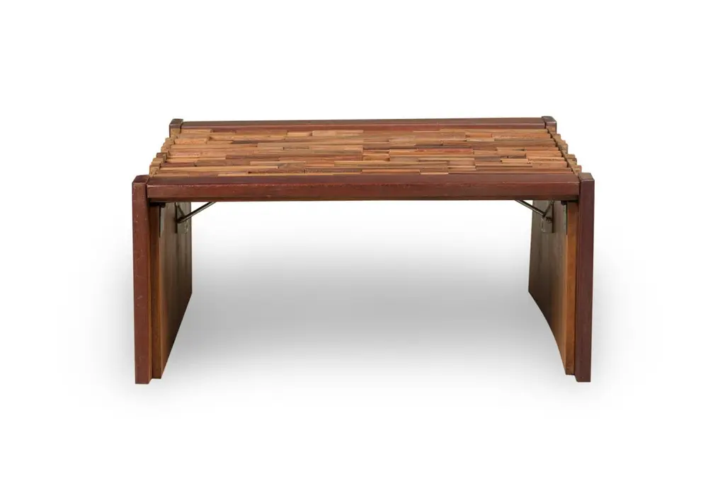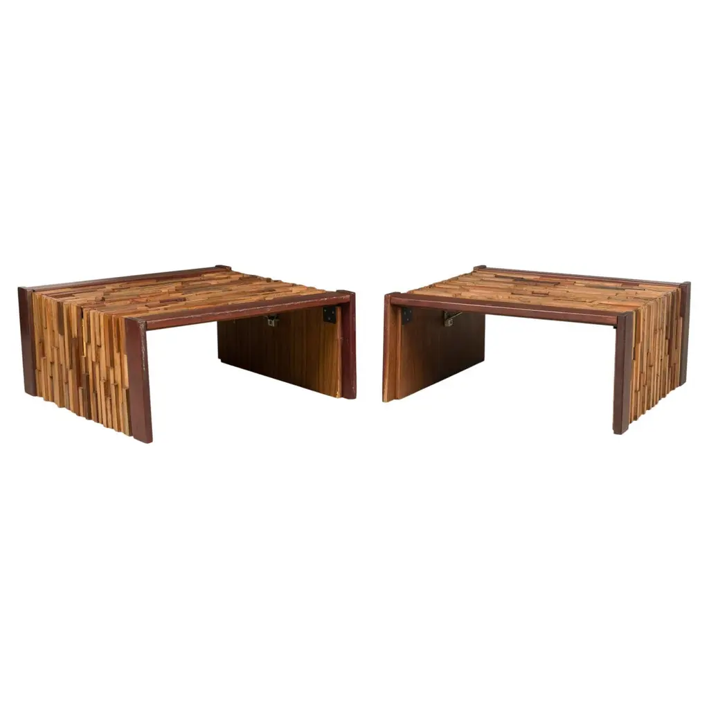2 Mid-Century (Brazilian) square coffee tables featuring a mix wood pattern and mahoganny frame with collapsable side support panels (PRICED EACH)