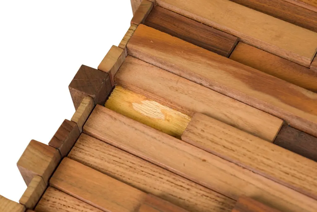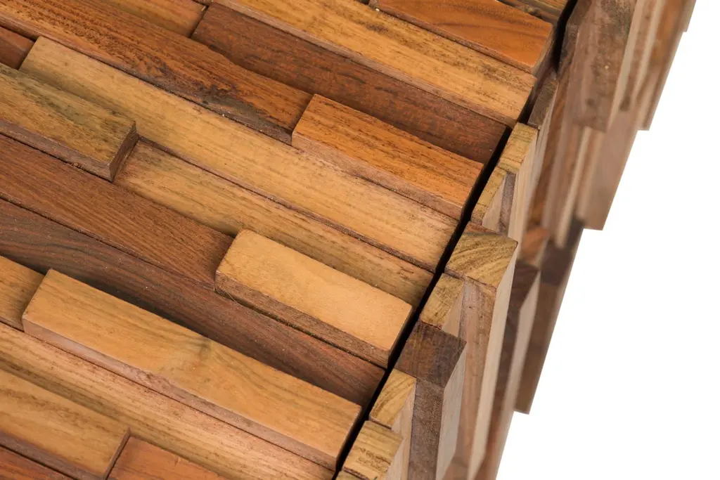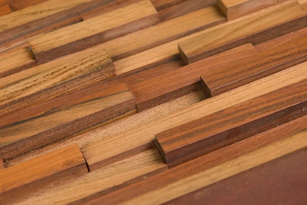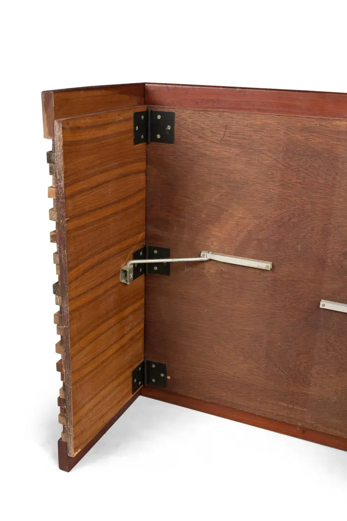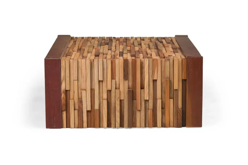 2 Mid-Century (Brazilian) square coffee tables featuring a mix wood pattern and mahoganny frame with collapsable side support panels (PRICED EACH)