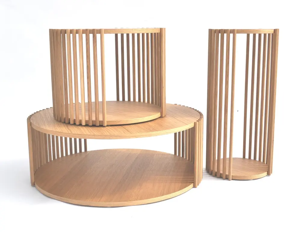 The Palafitte collection, inspired by Venice, the floating city, takes its cue from the urban system of wooden poles submerged in water, supporting the city’s structures. This design concept is echoed in the collection’s coffee tables, featuring circular tops that, depending on the perspective, appear to rest delicately on slender wood strips or float in precarious balance. The tables are made from solid wood slats and veneered in oak or Canaletto walnut, with tops available in various diameters (Ø83 x h30cm). Their minimalist yet elegant structure is characterized by a graphic interplay of vertical and horizontal lines, offering multiple configurations for living areas, bedrooms, lounges, or hotel spaces. The range of sizes and heights provides flexibility, making them ideal for diverse project requirements and environments
