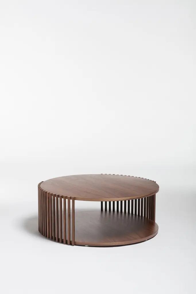 The Palafitte collection, inspired by Venice, the floating city, takes its cue from the urban system of wooden poles submerged in water, supporting the city’s structures. This design concept is echoed in the collection’s coffee tables, featuring circular tops that, depending on the perspective, appear to rest delicately on slender wood strips or float in precarious balance. The tables are made from solid wood slats and veneered in oak or Canaletto walnut, with tops available in various customizable diameters. Their minimalist yet elegant structure is characterized by a graphic interplay of vertical and horizontal lines, offering multiple configurations for living areas, bedrooms, lounges, or hotel spaces. The range of sizes and heights provides flexibility, making them ideal for diverse project requirements and environments