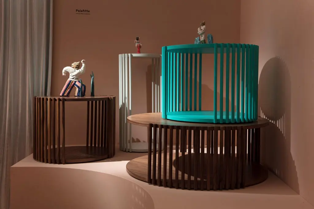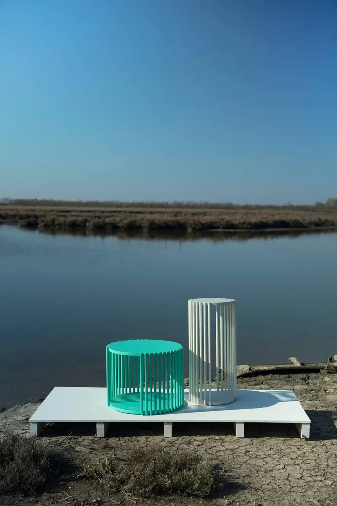 The Palafitte collection, inspired by Venice, the floating city, takes its cue from the urban system of wooden poles submerged in water, supporting the city’s structures. This design concept is echoed in the collection’s coffee tables, featuring circular tops that, depending on the perspective, appear to rest delicately on slender wood strips or float in precarious balance. The tables are made from solid wood slats and veneered in oak or Canaletto walnut, with tops available in various diameters (Ø33 x h 70cm). Their minimalist yet elegant structure is characterized by a graphic interplay of vertical and horizontal lines, offering multiple configurations for living areas, bedrooms, lounges, or hotel spaces. The range of sizes and heights provides flexibility, making them ideal for diverse project requirements and environments.