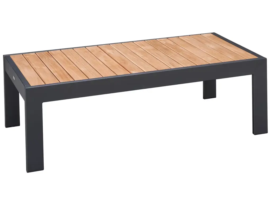 Add beautiful contrast to your outdoor furniture setup with the ScanCom Palau Rectangular Coffee Table. This contemporary table features a rectangular, slatted teak wood top supported by square legs in a contrasting dark grey. Perfect for serving drinks and snacks at your next backyard barbecue.