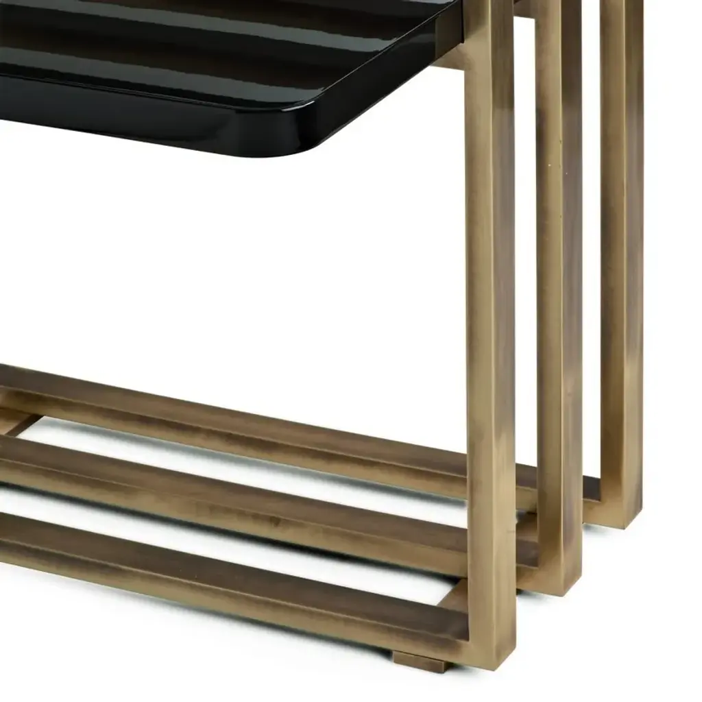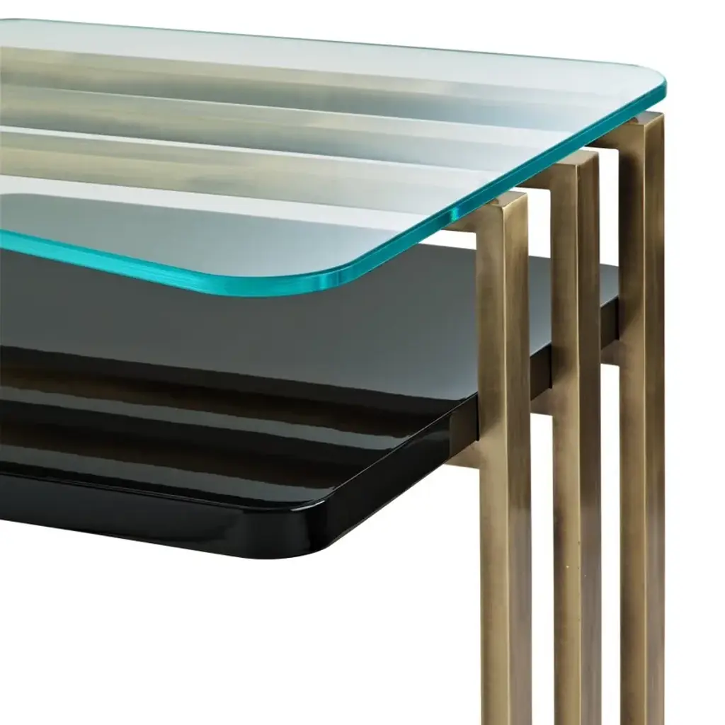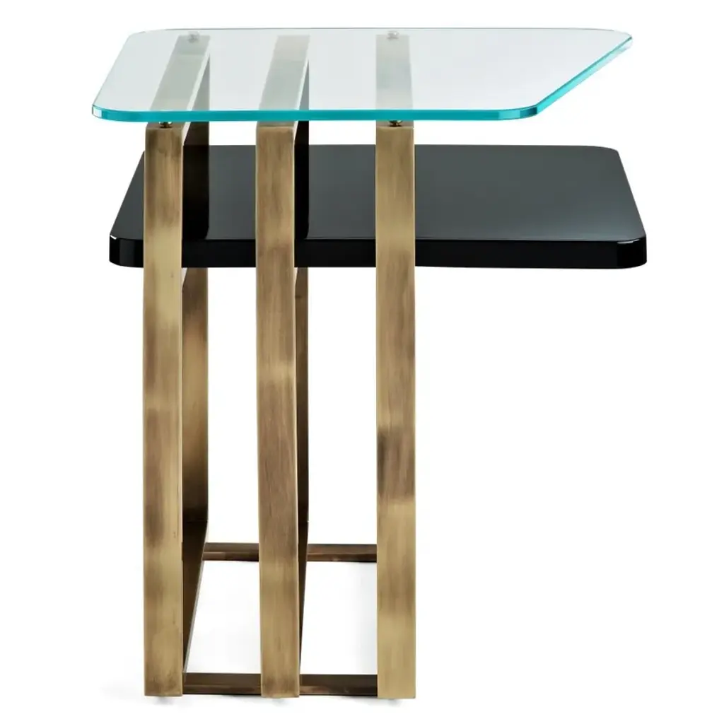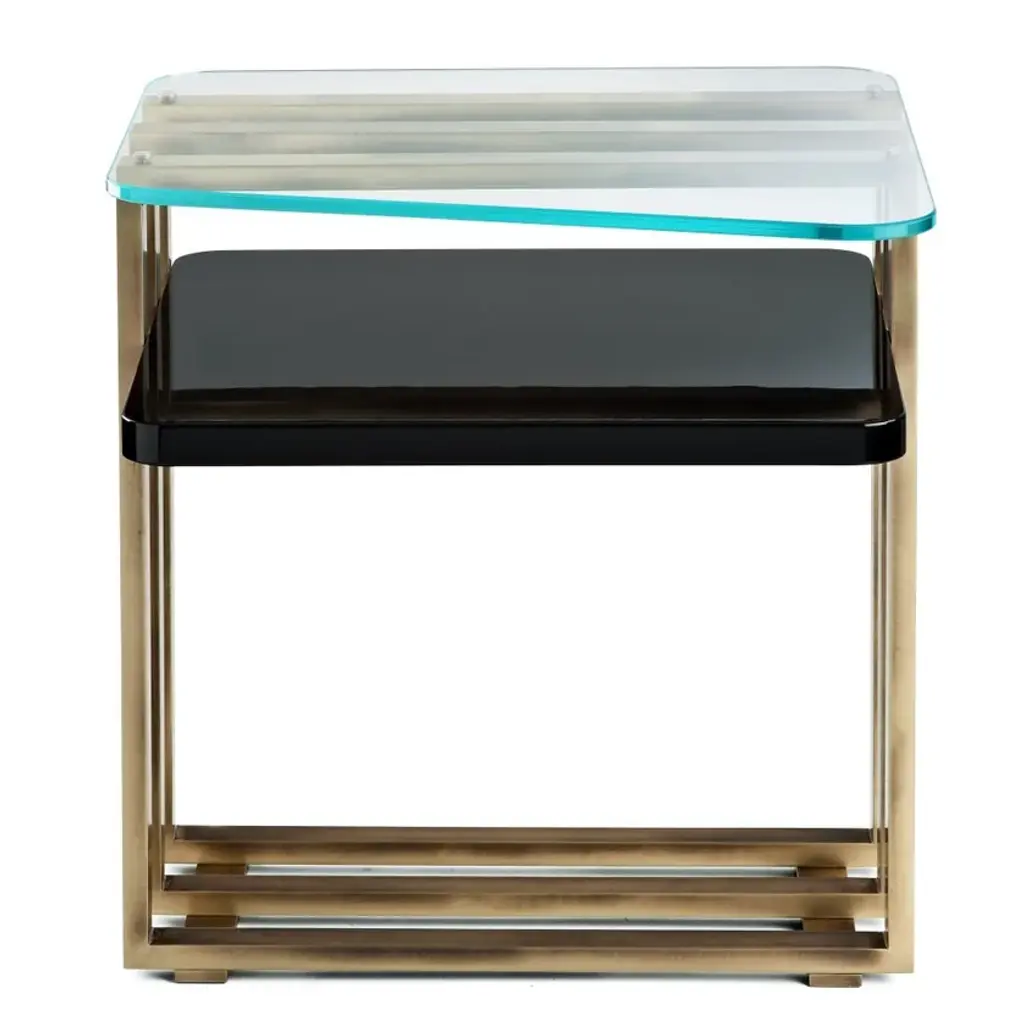 Square coffee table with lacquered wood shelf, brushed brass structure and extra-clear glass top. Available in different material combinations.