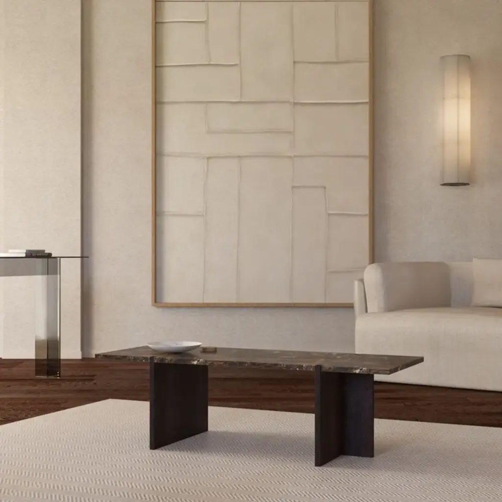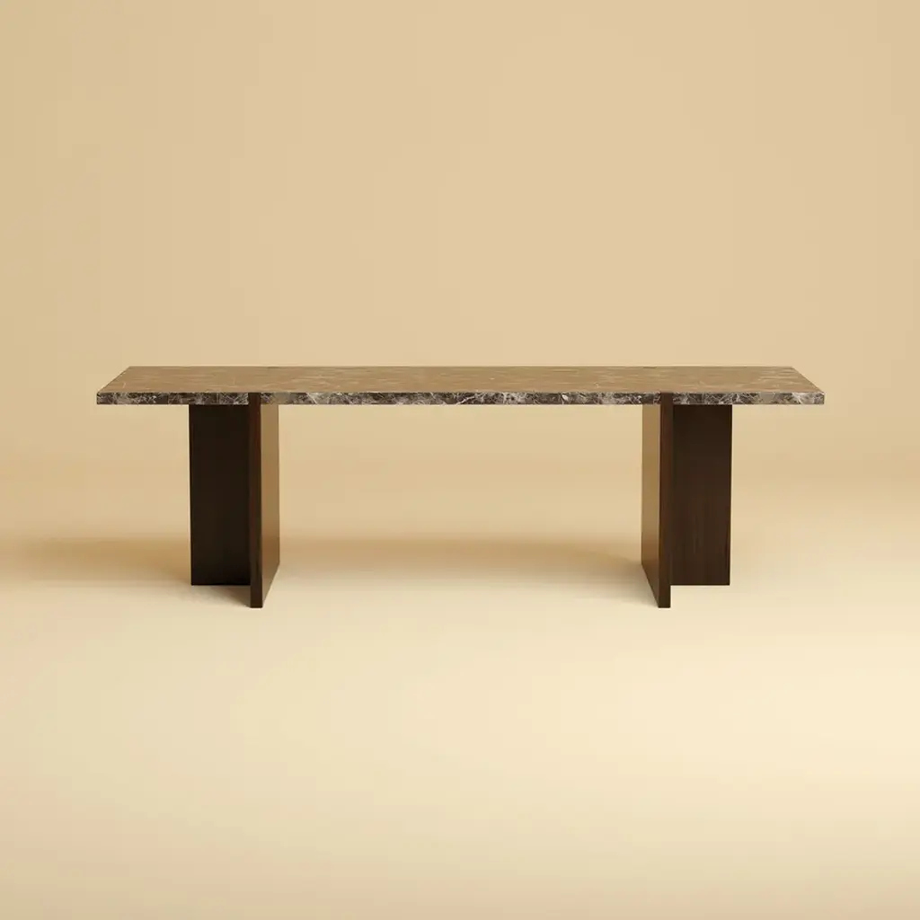 Palm is rectangular wooden and marble Emperador Dark lounge table.The Palm lounge table by Lebanto is a masterpiece of modern design and Italian craftsmanship, featuring a luxurious marble or travertine tabletop and solid oak legs. This elegant lounge table stands out with its unique interlocking leg detail, where the solid oak legs seamlessly connect with the tabletop, creating a striking and artistic focal point. The Palm effortlessly combines natural materials with innovative design, making it perfect for adding a touch of sophistication to any space. The Palm is available with your choice of premium marble or travertine, offering a natural, high-end finish that pairs beautifully with the warmth and durability of solid oak. Its minimalist design and intricate craftsmanship make it a versatile addition to both contemporary and classic interiors, enhancing your space with its clean lines and organic textures.