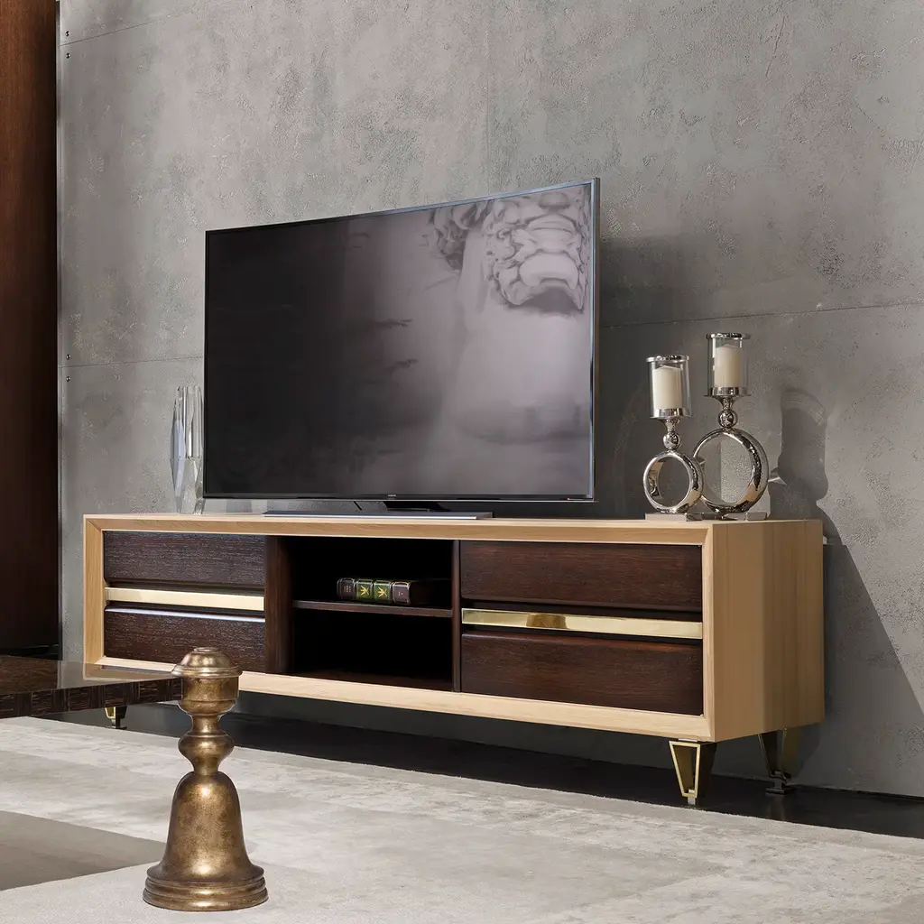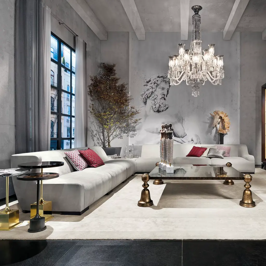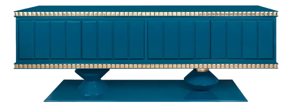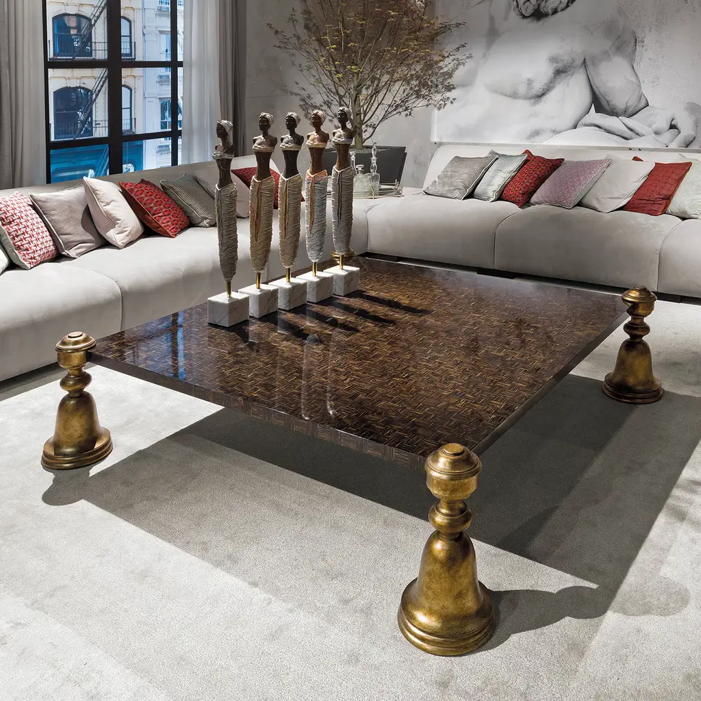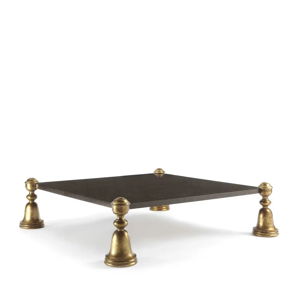 A stately and extraordinarily lavish design, this magnificent coffee table will not go unnoticed in any decor style. Sculptural yet clean in character, it features a precious palm wood top and rests on bell-shaped wooden legs finished with fine gold leaf. Please refer to the Concierge for further details and customization options.