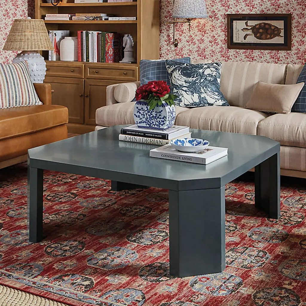 Our Palmer Coffee Table is perfectly scaled to serve a large family room sectional or living room furniture group. The octagonal silhouette is crafted of hardwood and hand finished in lustrous navy blue for a bold punch of eye-catching color that works beautifully with our favorite designer fabrics. The clipped corners allow for easy traffic flow in busy family spaces. Palmer Coffee Table features: