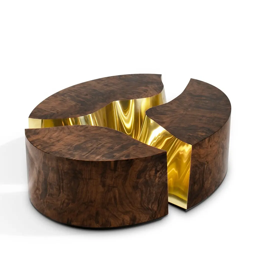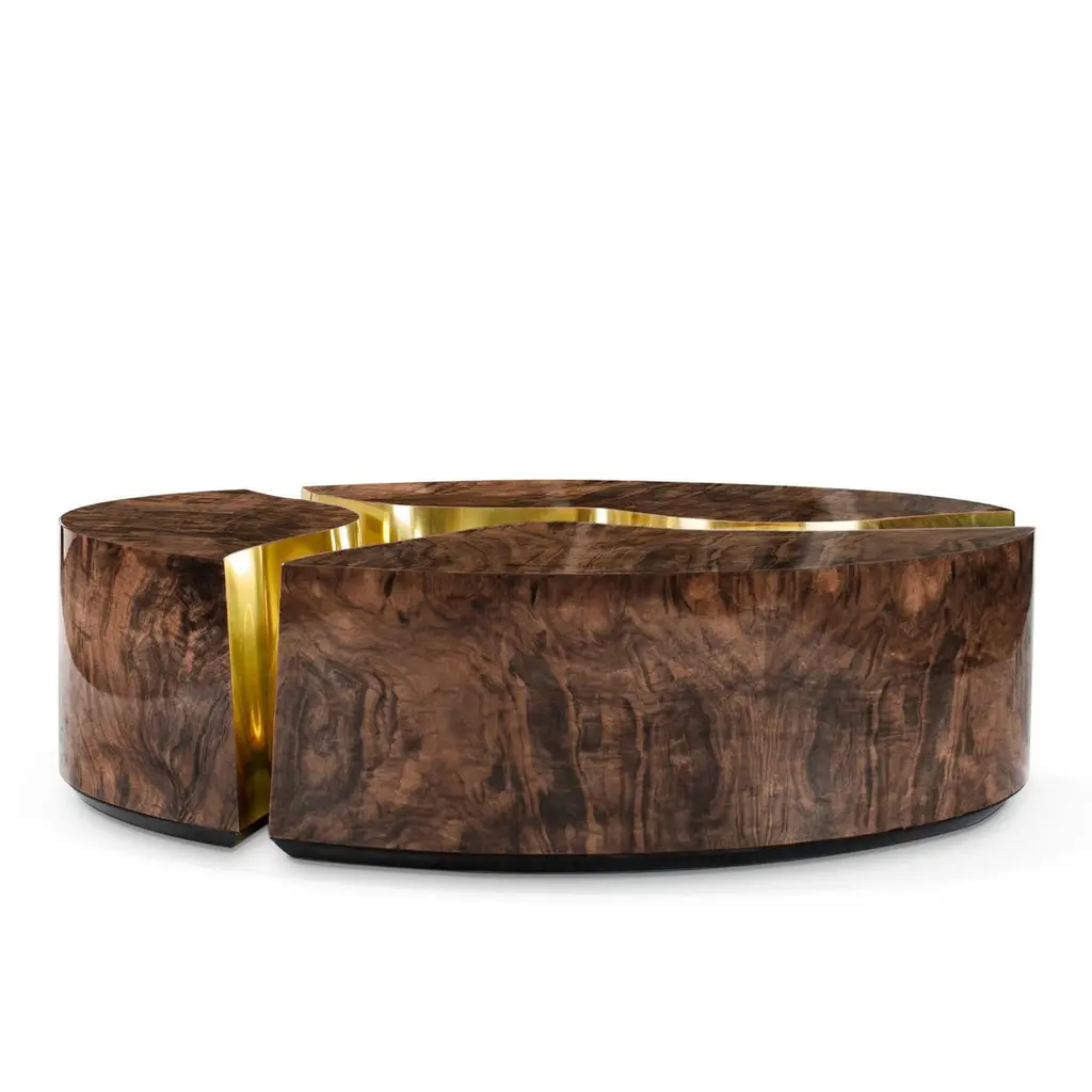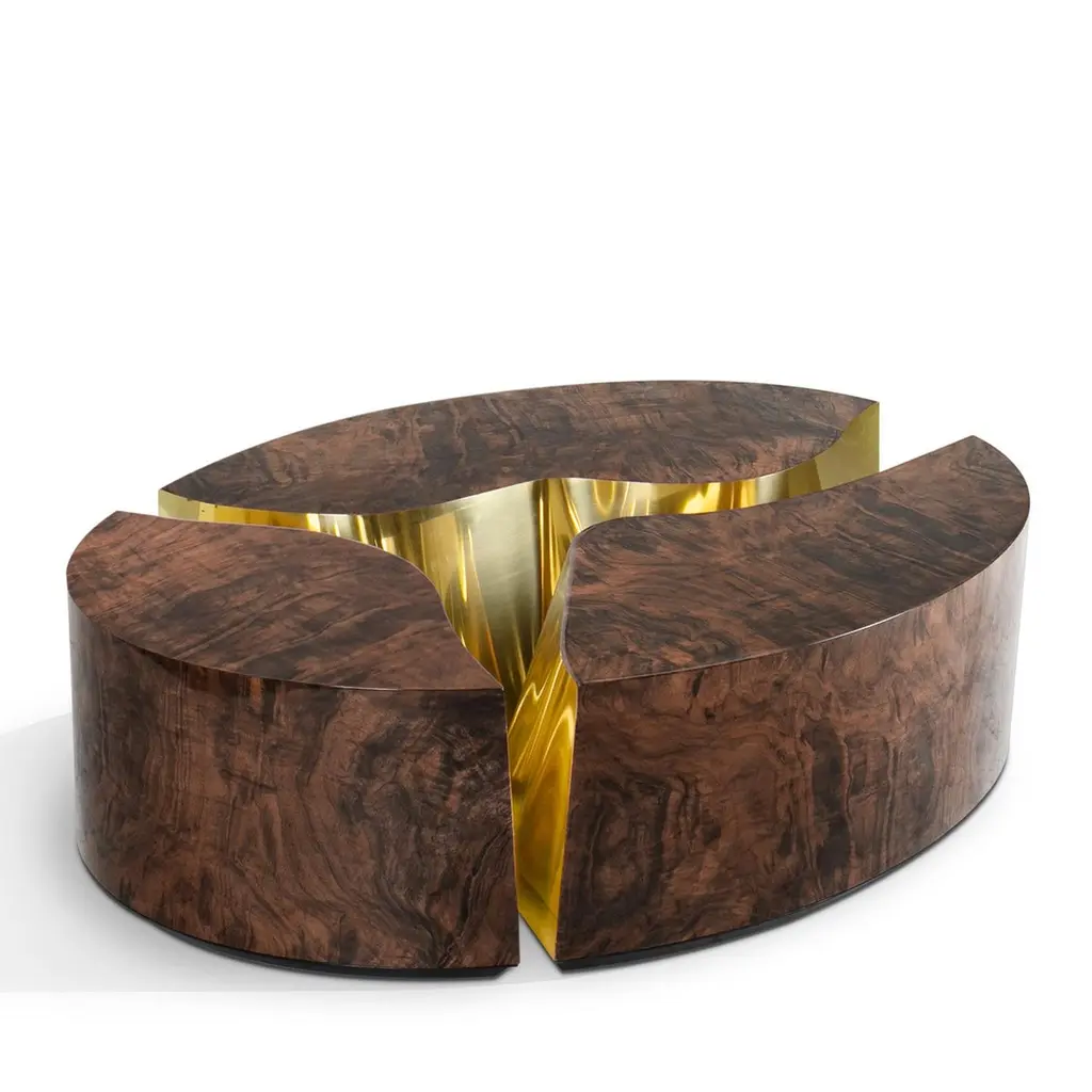 Paradise Walnut Oval Coffee Table composed of 3 structures in wood with walnut root veneer with glossy varnished finish withpolished brass on one edge of each structure.