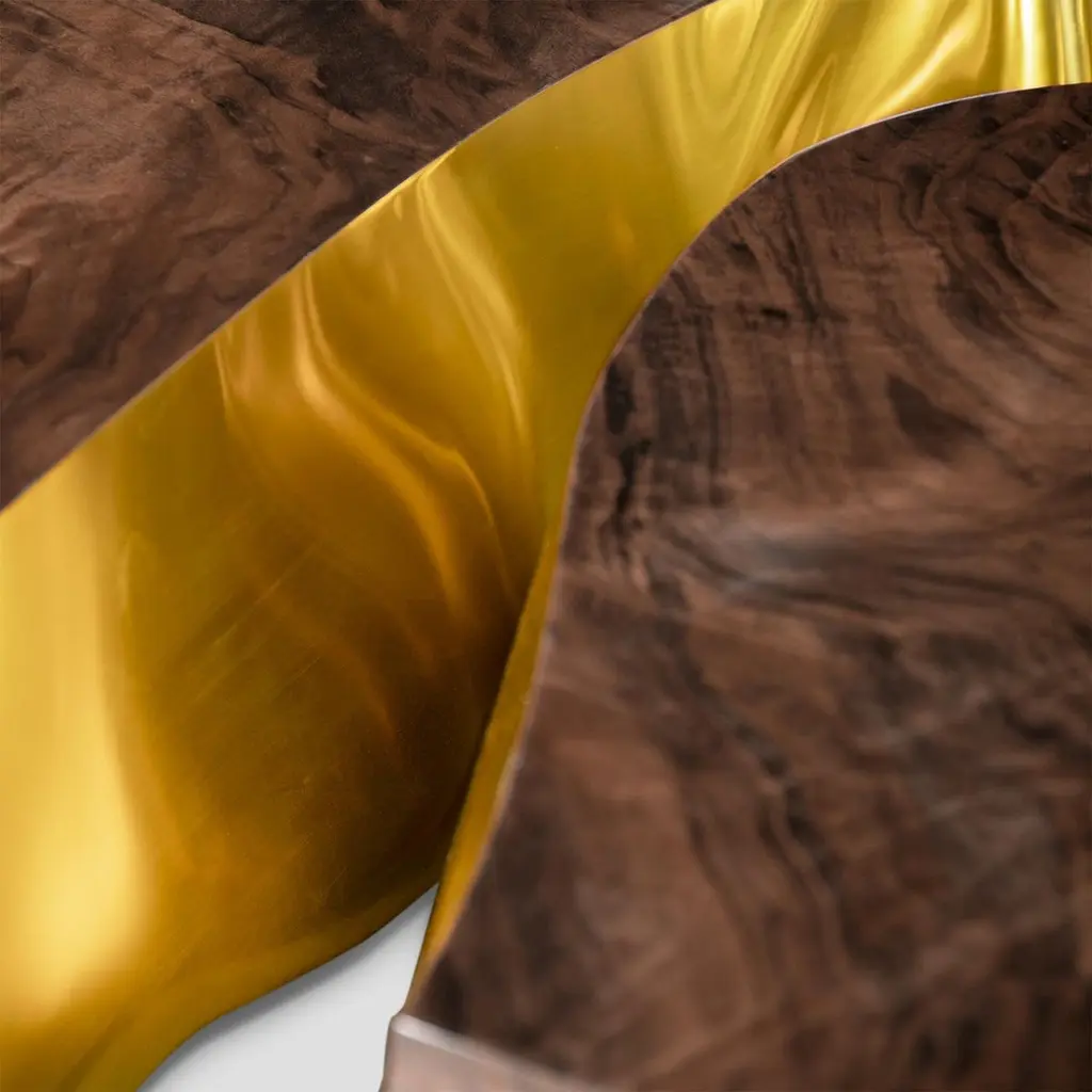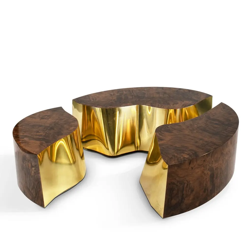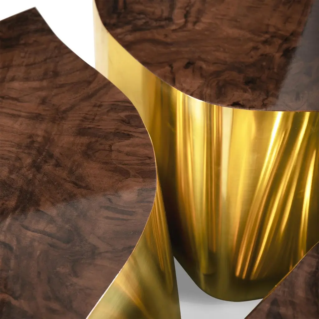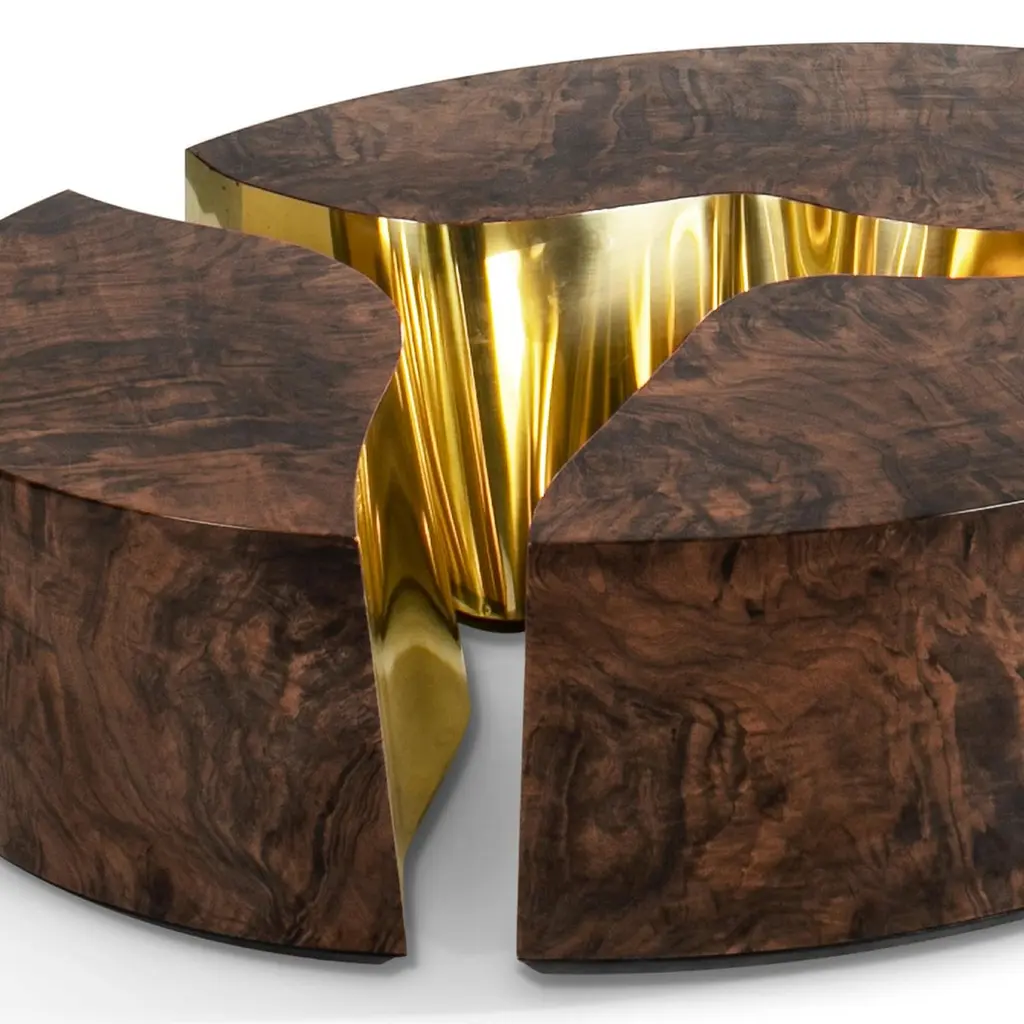 Paradise Walnut Oval Coffee Table composed of 3 structures in wood with walnut root veneer with glossy varnished finish withpolished brass on one edge of each structure.