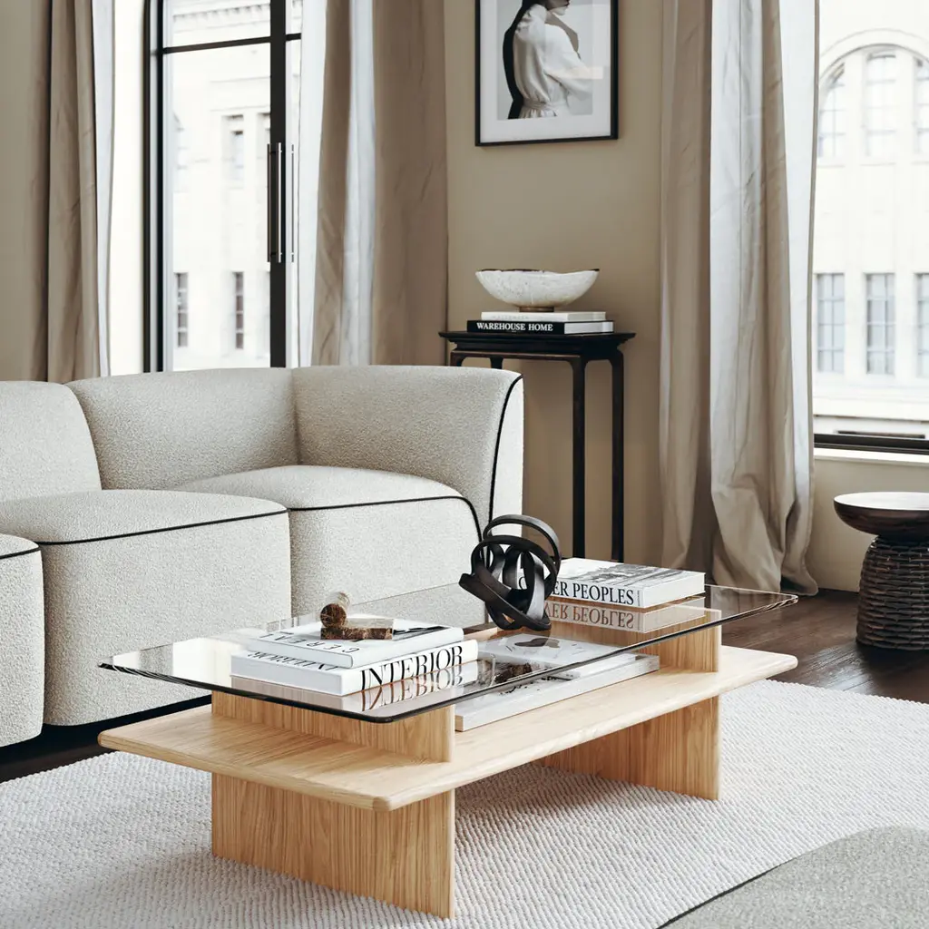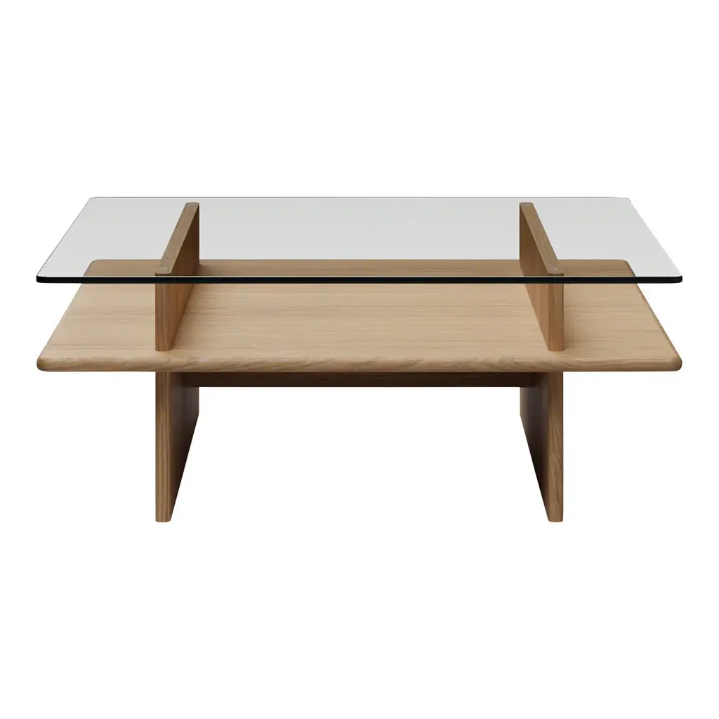 Inspired by the display showcases found in museums, the Parallel coffee table plays with the integration of curated galleries in the home. By leveraging glass, the space between the horizontal planes serves as an aesthetic exhibition area for books and decorative objects in the living room.
