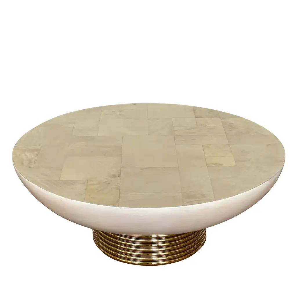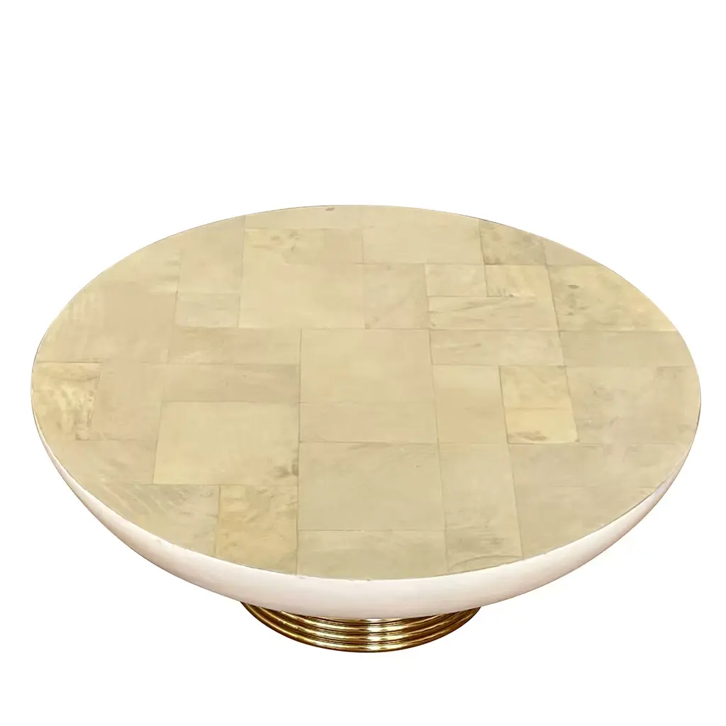 Sitting on a base of brass rings welded together, a curved ivory-lacquered wooden top playfully reminiscent of an egg distinguishes this coffee table. Its bold character is elevated by the layer of natural parchment sealing the top. Sophisticated and daring, it makes for an eye-catching addition to modern living rooms.