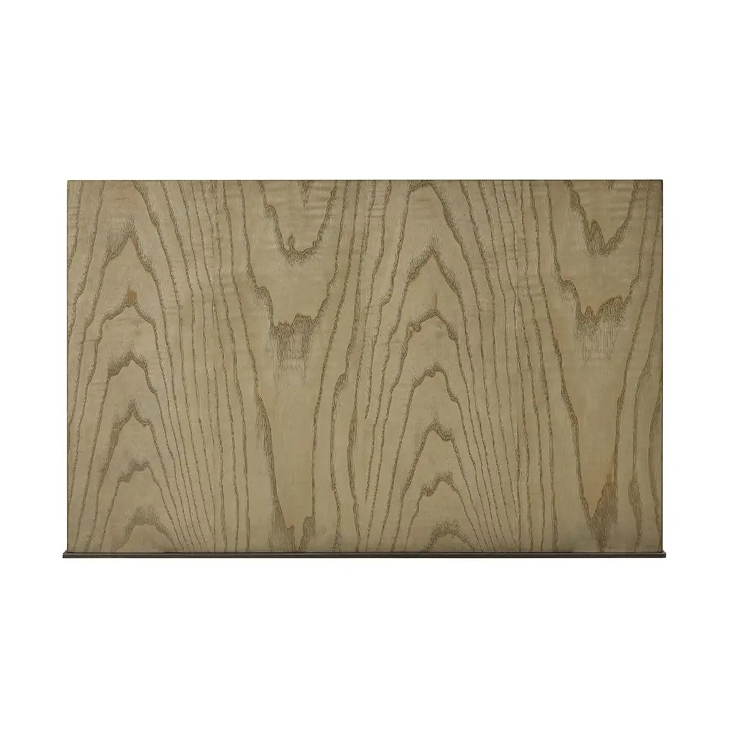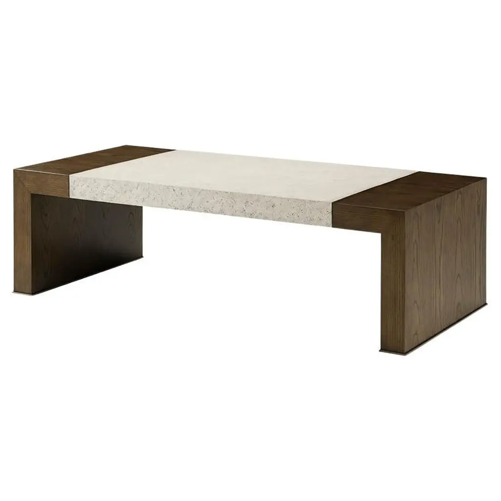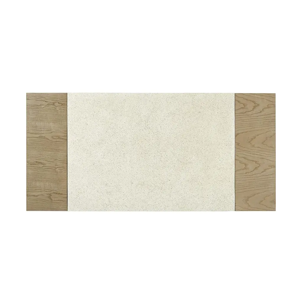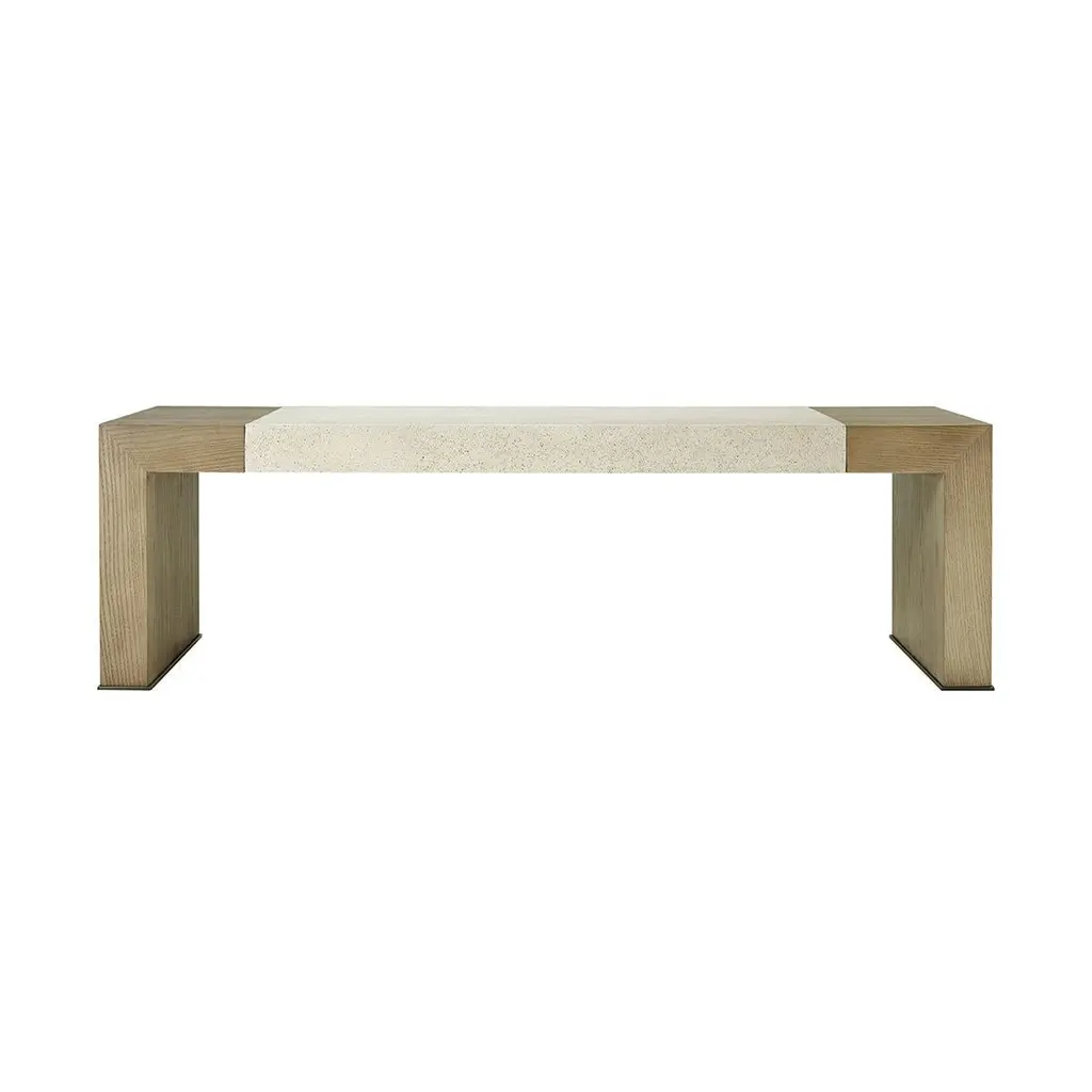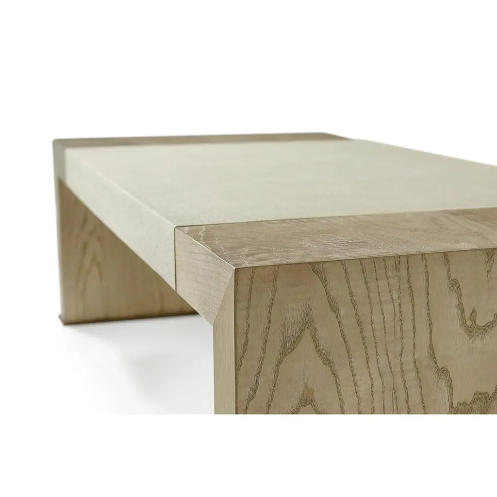 A modern parsons style cocktail table made of figured cathedral ash in our light dune finish with our exclusive Mineral finish at the top and metal detail at the base of the legs in a bronze finish.Dimensions: 55" W x 26" D x 16.5" H