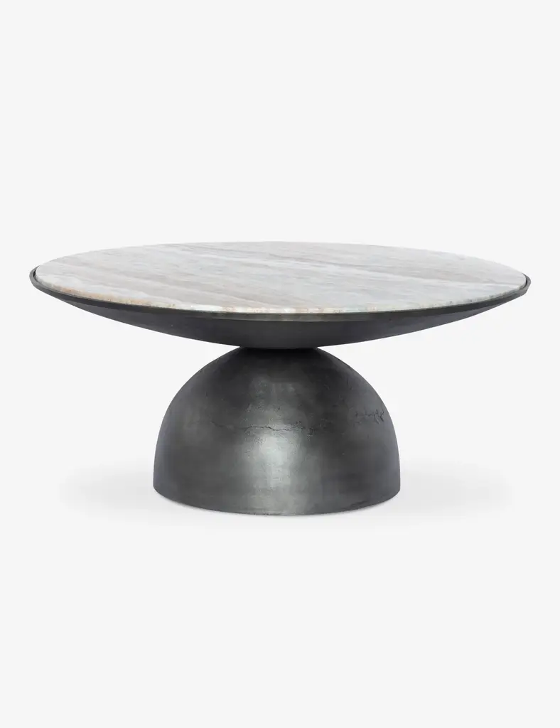 Modern and sculptural, this round coffee table brings artful balance to your living room. The half-sphere pedestal base supports a round marble table top for contrasting tone and texture.