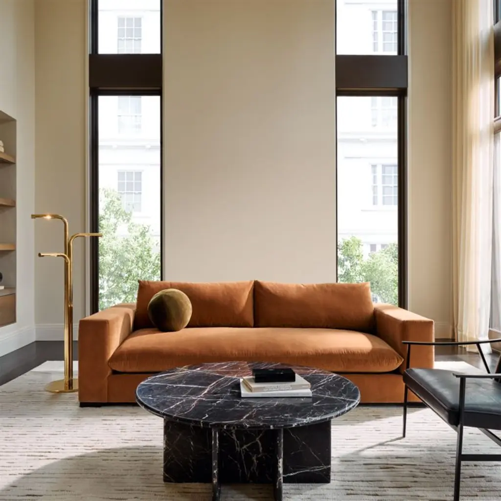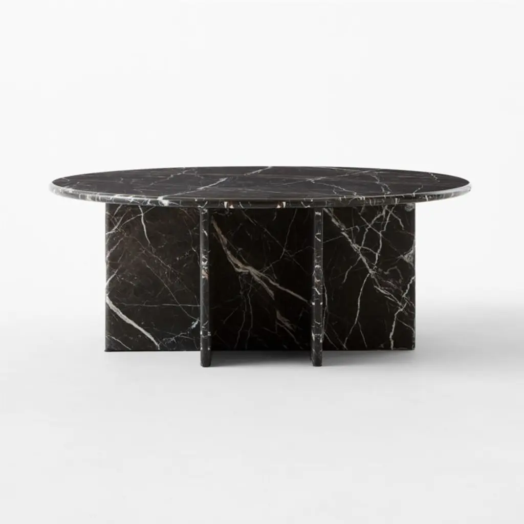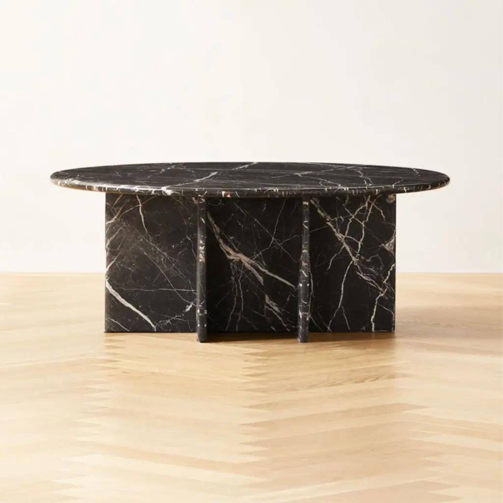 Crafted with highly active black Saint Laurent marble, coffee table by VUUE incorporates geometric design elements for a stunning silhouette. The marble's dynamic white veining and striking tones of cocoa and copper give it mesmerizing allure, and the variation inherent to natural stone ensures that no two tables will be alike. CB2 exclusive.