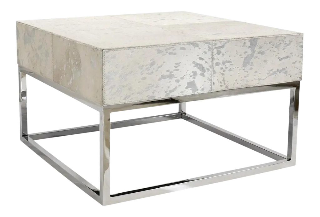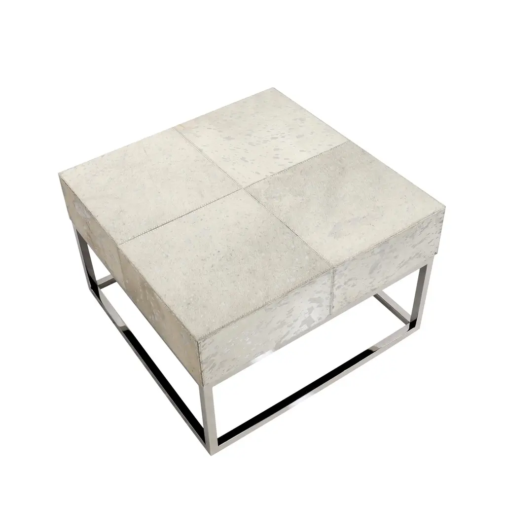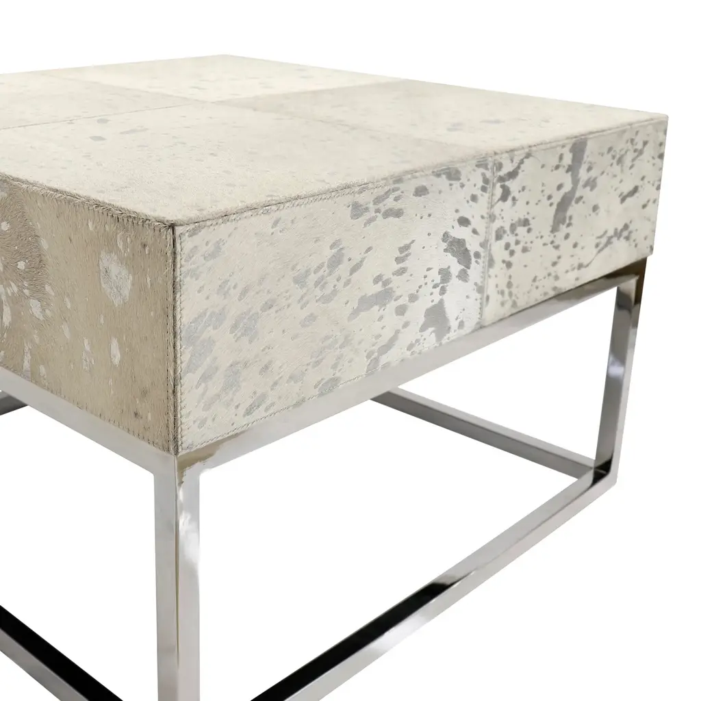 Introducing our Safari collection. an exotic collection of bright cowhides complimented by foil. This contemporary collection exudes luxury and is sure to bring flair to any room. Assemble Size W24""XD24""XH15" Cowhide Top Size W24"XD24"XH5.5" Leg Height 9.5" Frame Thick 1" Silver Foil Cowhide Stainless Steel Base