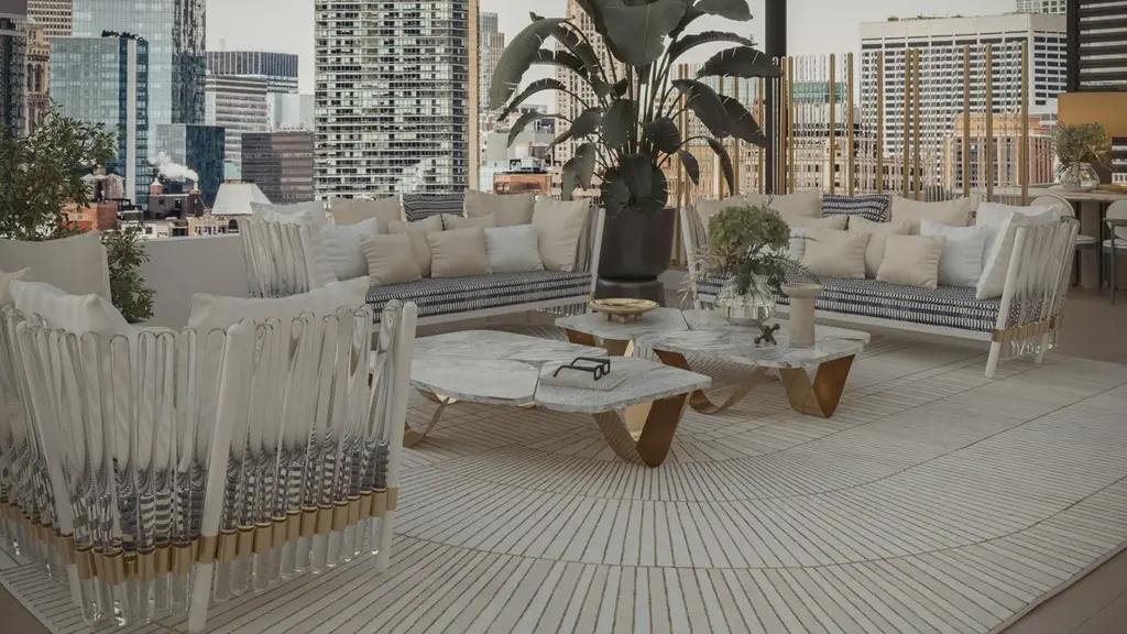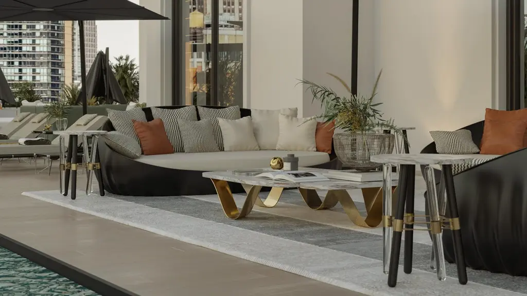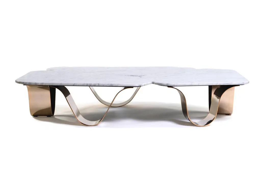 Kai Center Table The Kai outdoor coffee table combines design with light and wavy shapes, using materials such as marble and stainless steel with premium finishes, making it visually appealing. A large table that meets the requirements of a lounge space, drawing attention with its bold presence.The whole design of this contemporary outdoor side table was developed according to the following structure: - Top: Plated stainless steel, fiberglass or marble;- Structure: Plated stainless steel or lacquered fiberglass;All Myface materials are from premium suppliers, engineered to offer the best performance possible outdoors.Water, Mold, Mildew, UV and Fading resistance are some of the characteristics that you can expect from both materials, that are available in a wide array of colors and patterns.