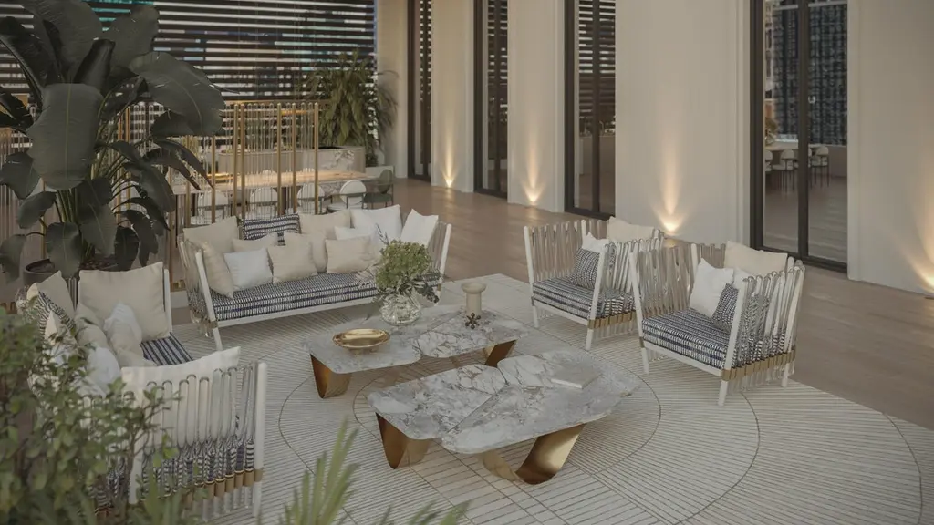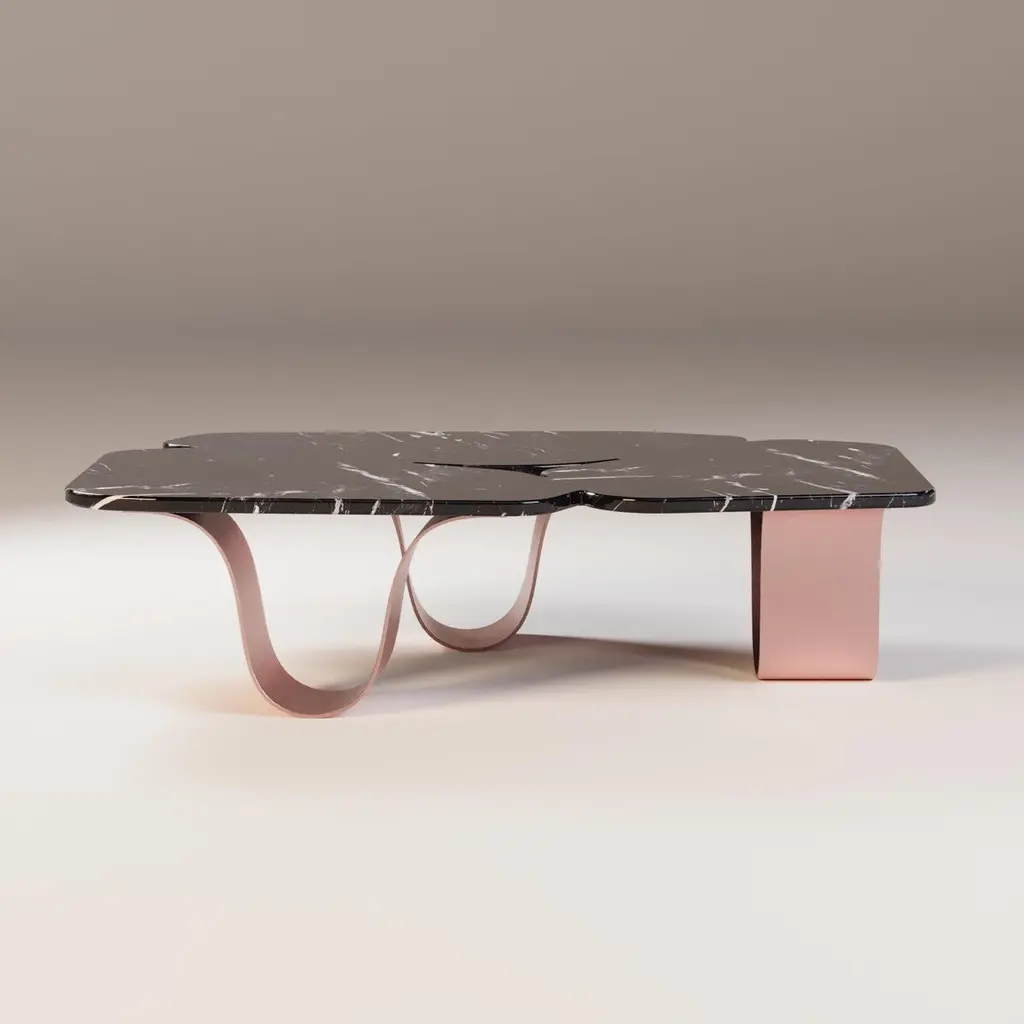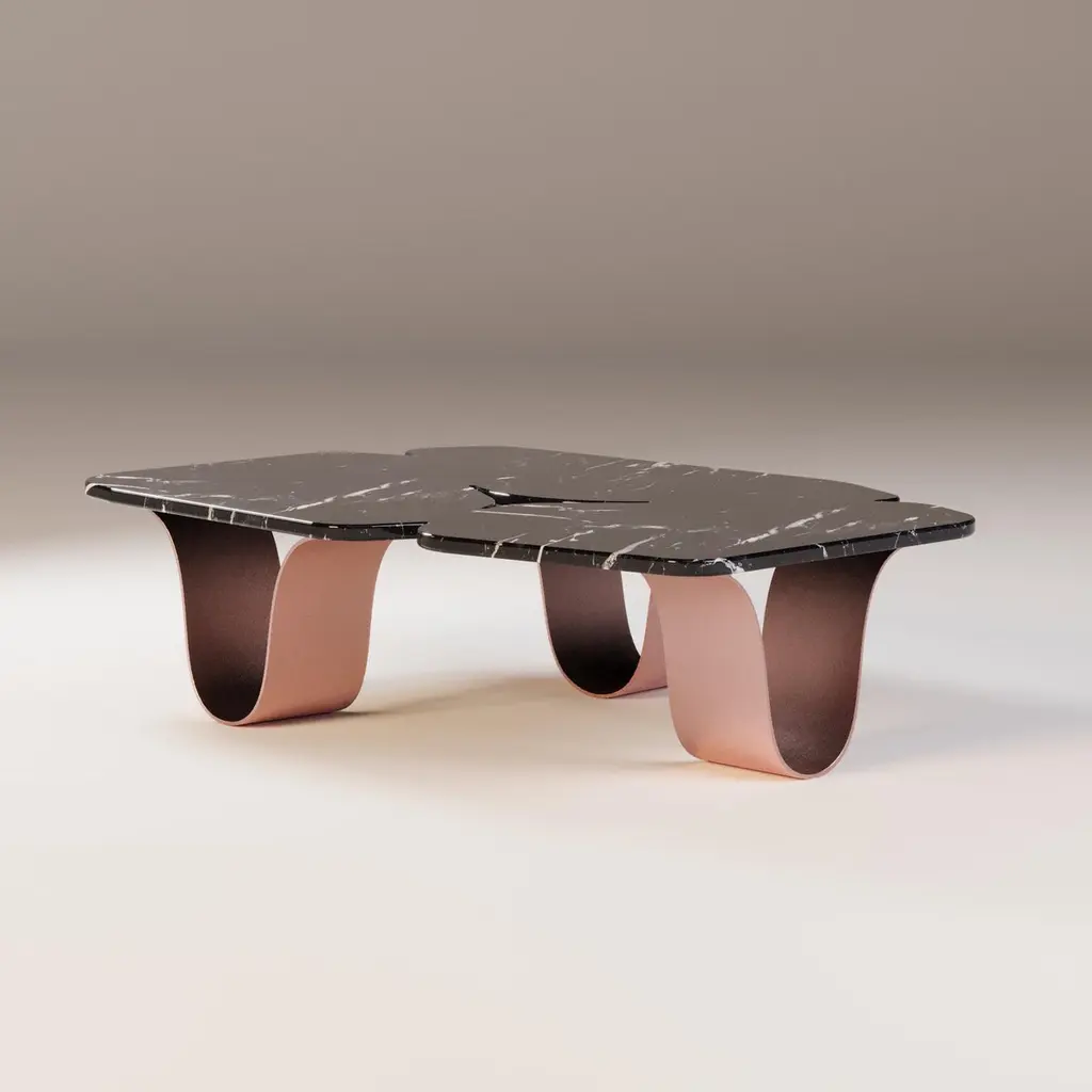 Kai Coffee Table The Kai outdoor coffee table combines design with light and wavy shapes, using materials such as marble and stainless steel with premium finishes, making it visually appealing. A large table that meets the requirements of a lounge space, drawing attention with its bold presence.The whole design of this contemporary outdoor coffee table was developed according to the following structure: - Top: Plated stainless steel, fiberglass or marble;- Structure: Plated stainless steel or lacquered fiberglass;All Myface materials are from premium suppliers, engineered to offer the best performance possible outdoors.Water, Mold, Mildew, UV and Fading resistance are some of the characteristics that you can expect from both materials, that are available in a wide array of colors and patterns.