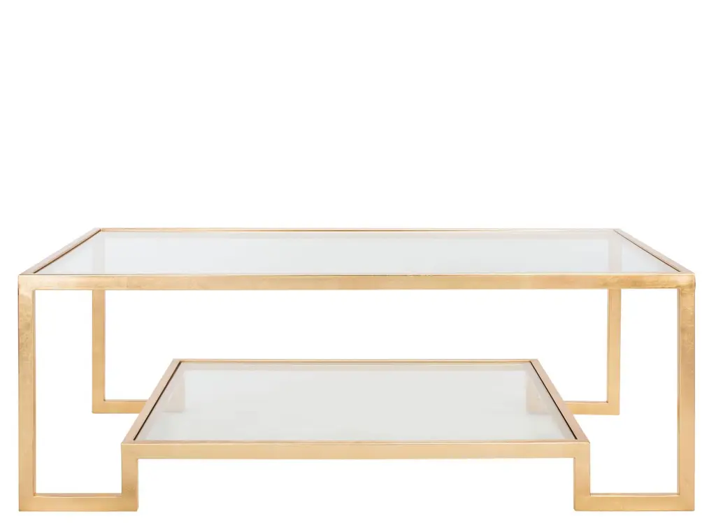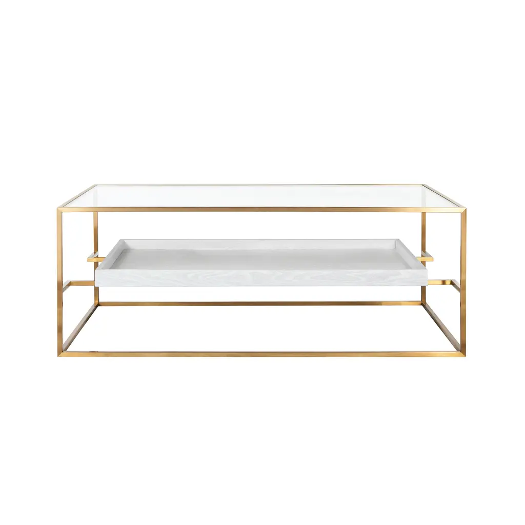 The standout coffee table is framed in stainless steel in a golden finish and topped with a clear glass surface. A lower openwork shelf with a glass overlay sits below, offering space for books or favorite accents.