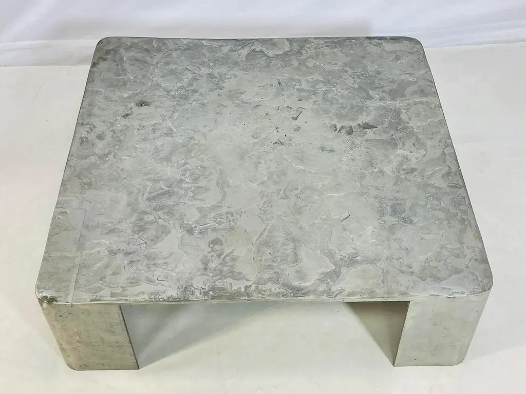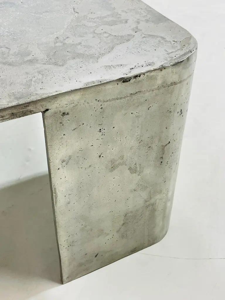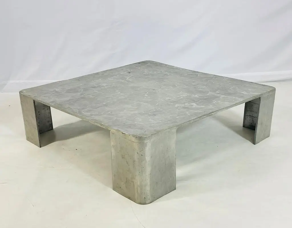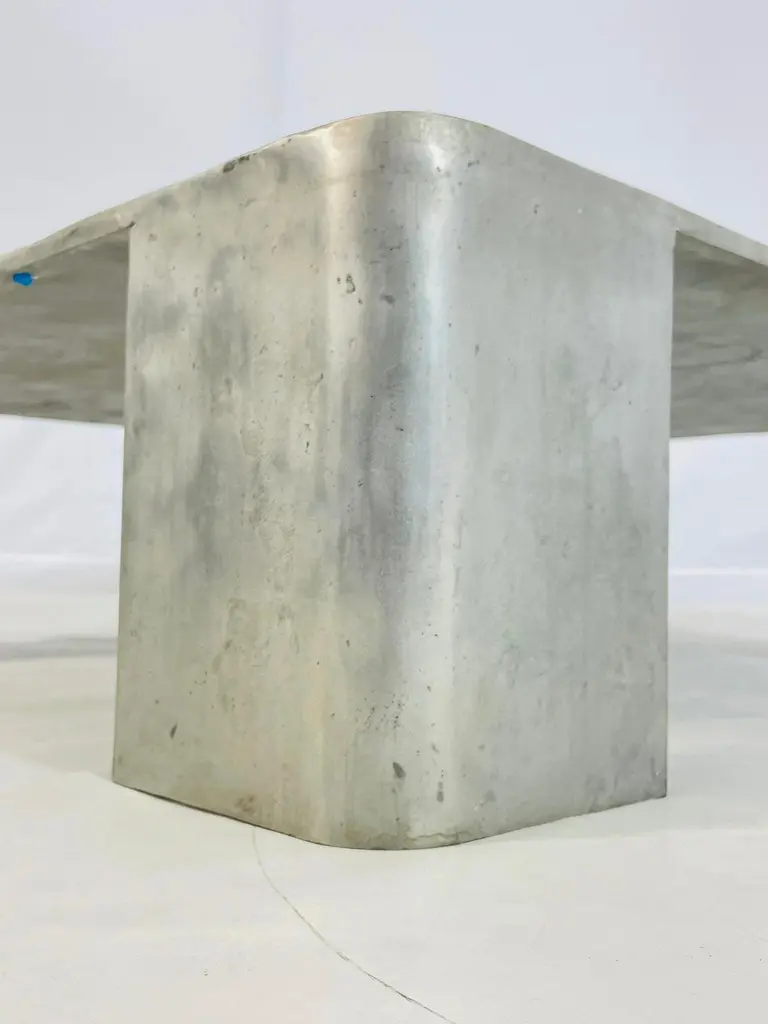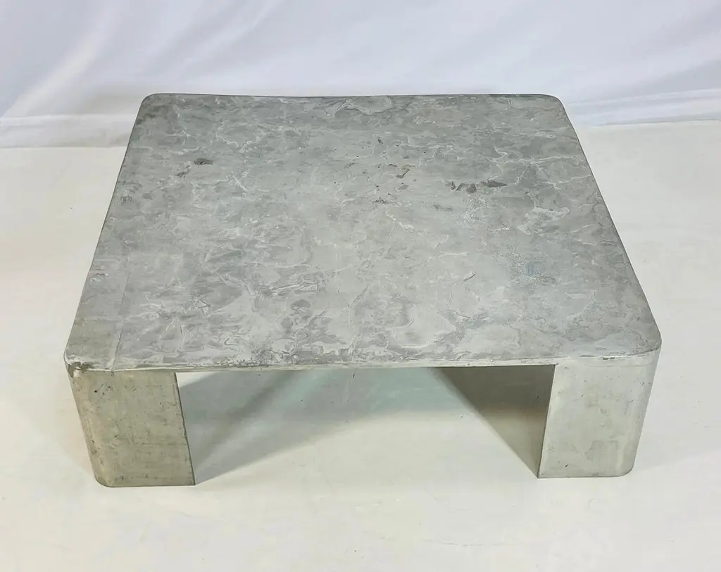 Striking in form and finish, this sculptural “Paulín” coffee table by OHLA Studio is crafted in cast aluminum, offering a bold reinterpretation of brutalist design. Made in Mexico, the table features a minimalist square silhouette with softened corners and thick, integrated legs that curve seamlessly into the top. The cast aluminum surface is richly textured with natural pitting and swirling patterns, lending it a raw, stone-like appearance while maintaining the durability and lightness of metal. A commanding centerpiece for modern, industrial, or art-forward spaces.Measurements: 42 inches wide x 42 inches deep x 12 inches high.