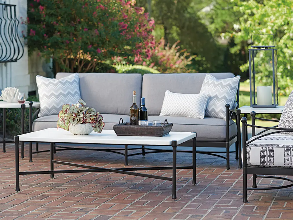 This outdoor cocktail table's top has the look and feel of honed limestone, but it's even easier to maintain. The subtly flared legs add timeless finesse.