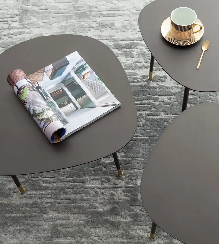 PEBBLE is a coffee table entirely in epoxy powder-coated metal in dark burnished finish with brushed brass varnish detail. A coffee table evoking the 1970s when slender legs encountered soft shapes and bold textures. Ideal for side-by-side or overlap to create playful arrangements that add movement to any living room.Available in two sizes:cod. HM.PEB.DM.MB: 48 x 47 x H 35 cmcod. HM.PEB.DI.MB: 58 x 57 x H 30 cmThe Enjoy Collection is Morica Design’s most sparkling, dynamic collection. The items are lively, inspired by nature, and find their soul in the pastel shades that blend and play with the wood in an original, fresh manner. The distinctive feature of Enjoy Collection is the use of color, declined in functional furnishings and contemporary mood. Modern and refined products made with high quality materials and handcrafted in Italy.