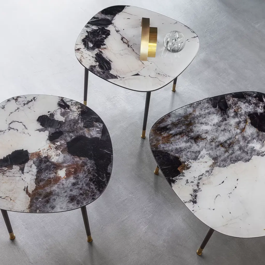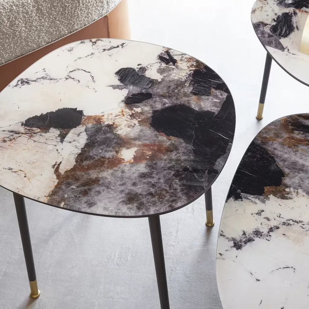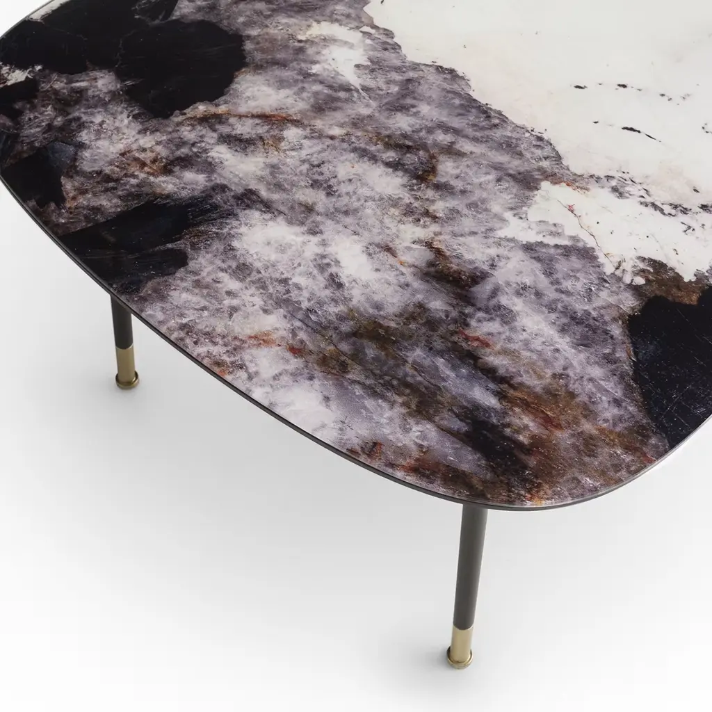 Echoing a certain '70s influence with its harmonious lines and impactful motifs, this coffee table is a refined modern design flaunting a superb reproduction of Patagonia marble on its 4mm-thick-shaped top in extra-clear tempered glass. Brushed brass tips softly brighten up the tips of its sleek metal legs, which are offered in a deep burnished finish obtained with epoxy powders.