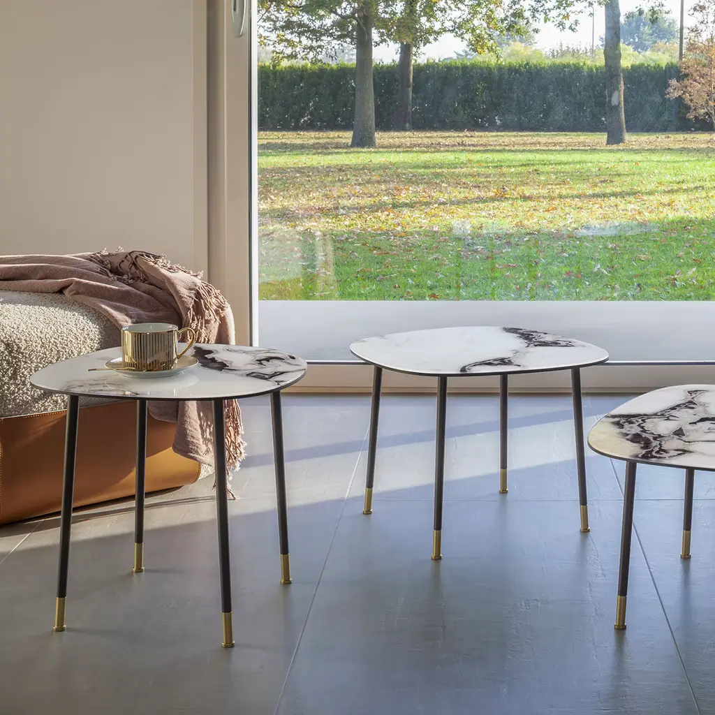 Traceries drawn by nature combined with solid artificial finishes coexist in this elegant coffee table, where the shaped top in extra-clear tempered glass flaunts a superb Trinity White marble effect. Reminiscent of a pebble, the 4mm-thick top rests on four linear burnished legs, varnished with epoxy powders and accented with brushed brass tips. More versions are available.