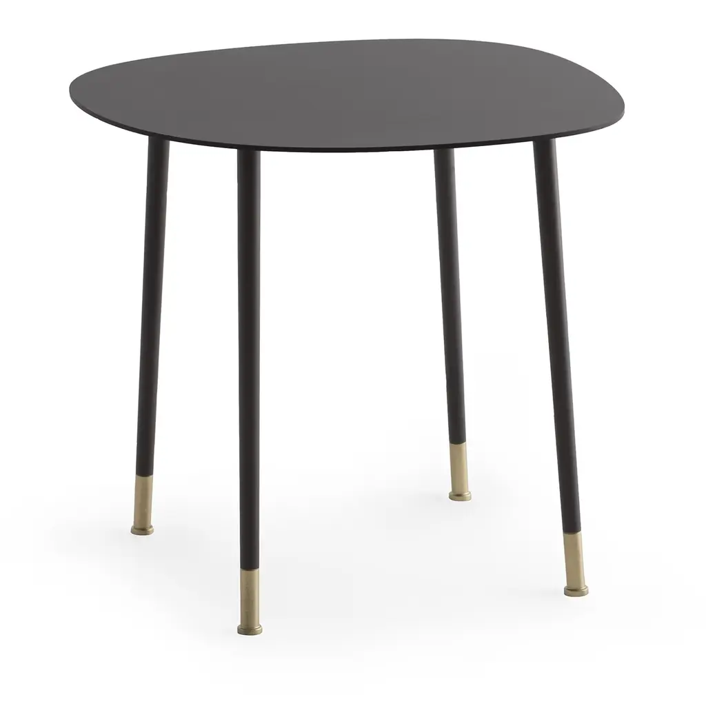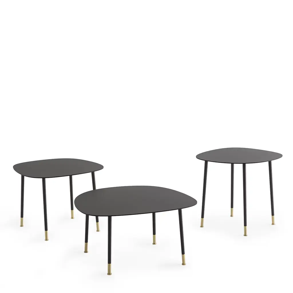 Sleek and harmonious lines trace the silhouette of this burnished metal coffee table, an exclusive piece ideally complementing modern living rooms. Varnished with epoxy powders, the structure is marked by a shaped top reminiscent of a pebble's profile. Brushed brass tips enliven the legs for slight accents of brightness. Different versions are available in the Artemest catalog.