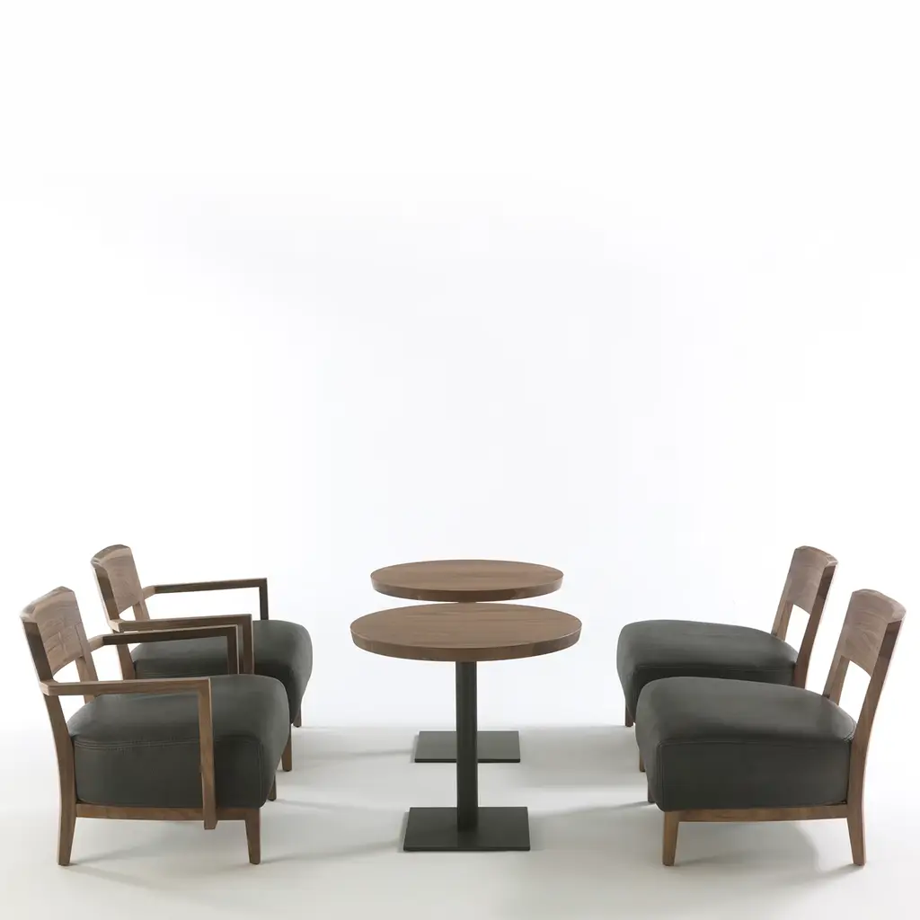 Ideally complementing a coffee bar or a nook in a private study, this round table by Terry Dwan is an exercise in harmonious contrast. The square base, where the pedestal element stems from, harmoniously conflicts with the circular oil-finished walnut top, its unique swirls and grain standing in contrast with the perfectly even anthracite-gray-lacquered iron structure.