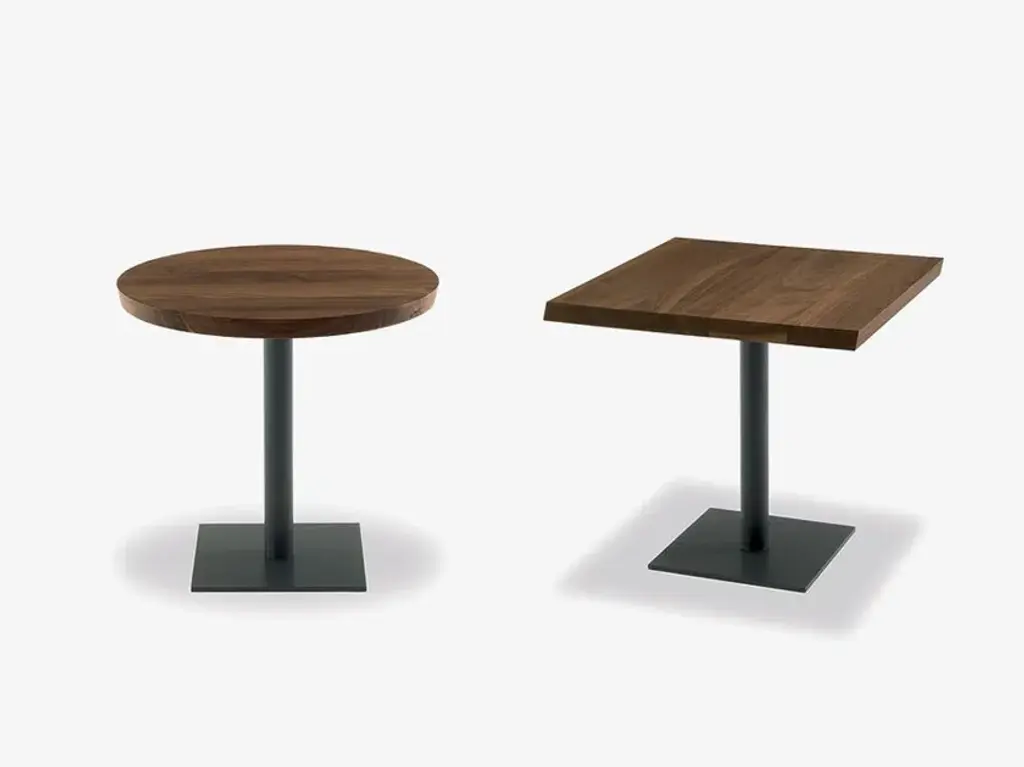 PEBBLES SMALL SQUARE is a square coffee table with a solid wood slatted top, featuring beveled edges that allow multiple elements to be placed side by side. The base and central support are made of lacquered iron.