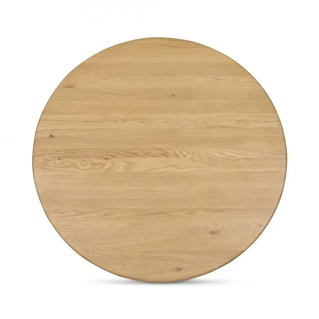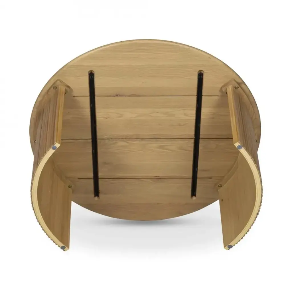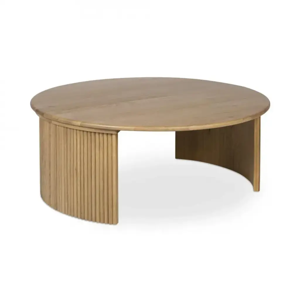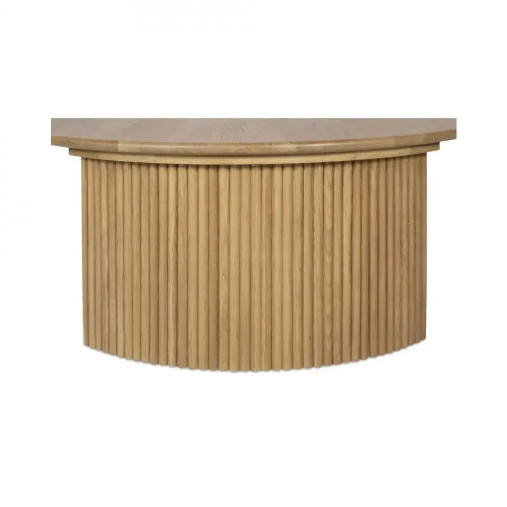 The Penny coffee table's nesting design showcases a circular tabletop with a refined bullnose edge set upon two curved bases adorned with playful, fluted detailing. These solid oak tables infuse dynamic visual interest with the smaller table designed to nest perfectly under the larger one--a harmonious blend of rustic charm and contemporary elegance.