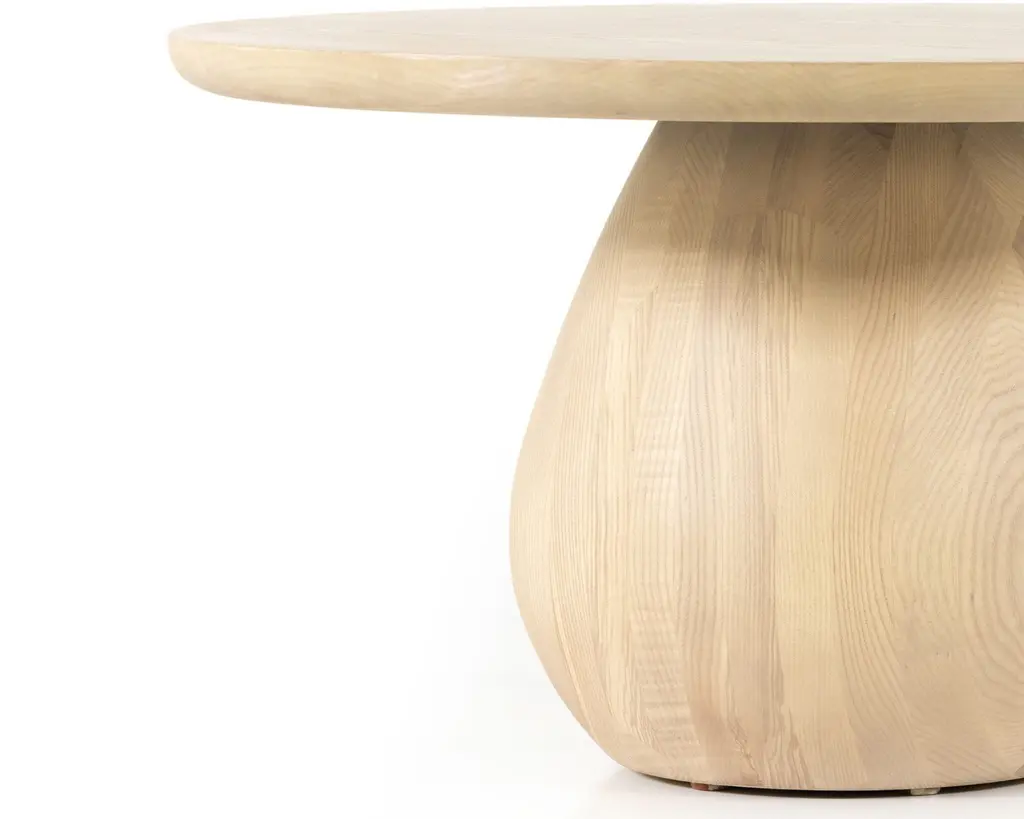 Make a shapely statement. A light-finished solid ash base supports a rounded tabletop, together spurring a soft, voluminous look with rich organic vibes. 27.5" W x 27.5" D x 15" H Shipping box: 32.5" W x 32.5" D x 20" H, 88lbs. Receives White Glove delivery.