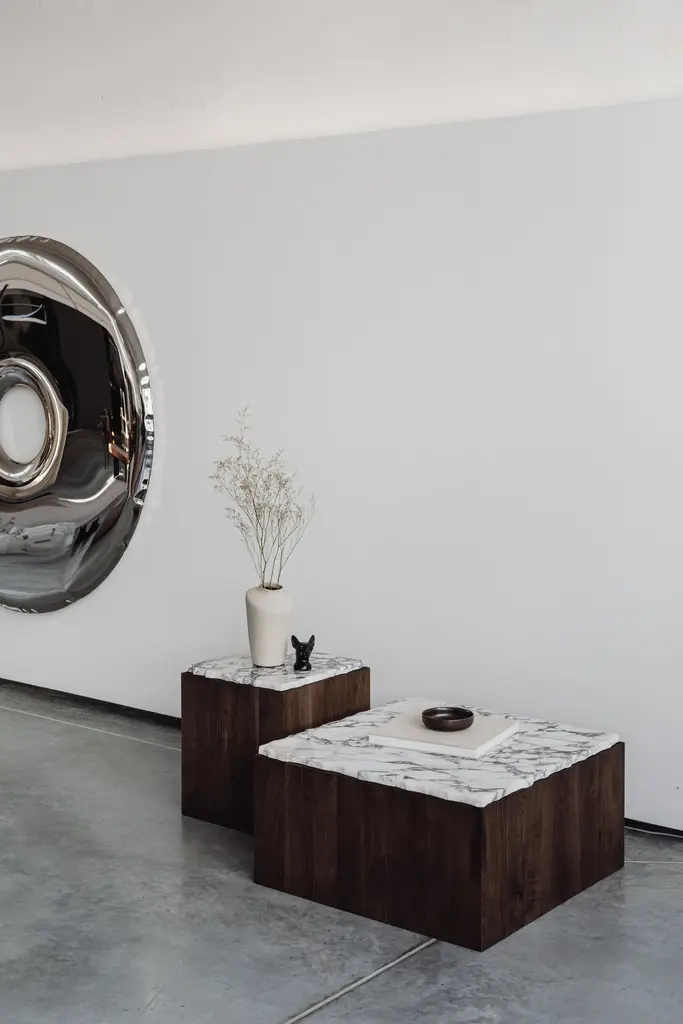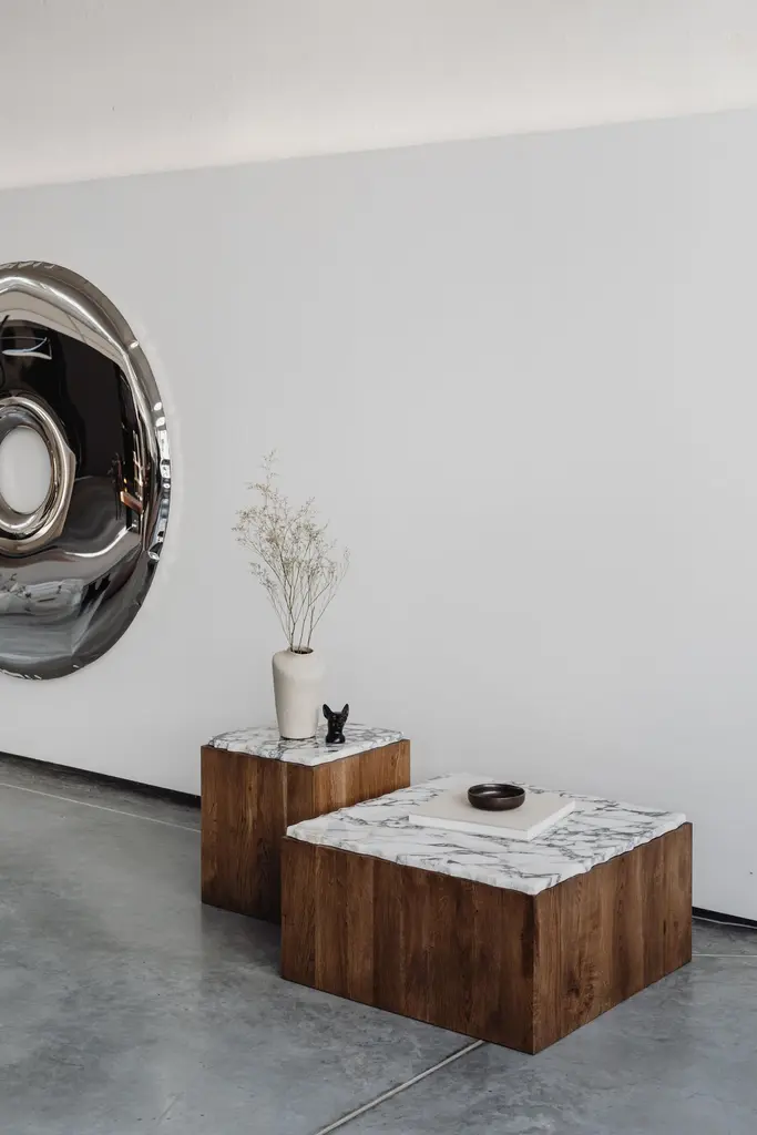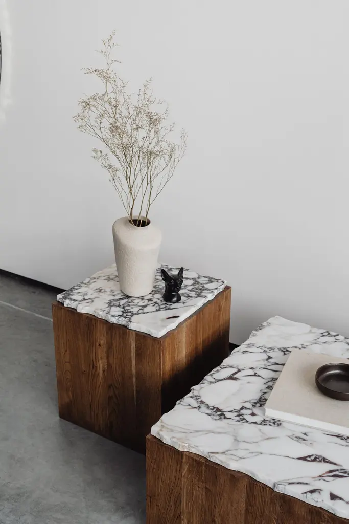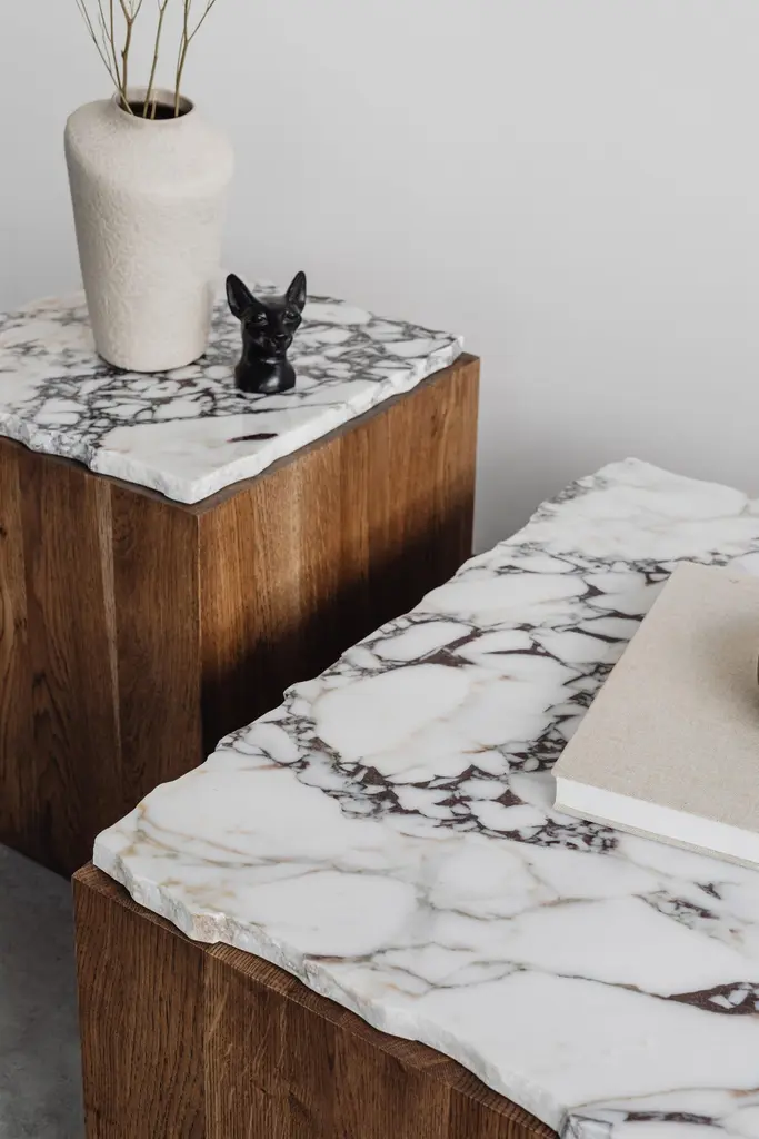 Pera M Coffee Table by Un’commonDesigned by Małgorzata Korycka.Dimensions: D 70 x W 70 x H 35 cm.Materials: Calacatta Viola marble and smoky oak.Available in different stone options: Carrara, Calacatta Viola, and Rosso Levanto. Also available in different oak finishes. Please contact us.PERA S is a small table that can be used as a coffee table or as an auxiliary table next to the couch. Its base is made of solid wood protected with a natural oil wax finish. It is available in 3 colors. However, the marble top with rough and irregular edges plays a key role here. Three types of marble tops and four colors of wood make it possible to compose the perfect piece of furniture for your interior.Our Polish workshop designs and hand-makes furniture from marble and steel. Our furniture should not only be well-designed – it should be a feast for the senses. Nothing can produce this effect quite as good as marble.It is a beautiful, refined, natural material used for centuries in architecture, art, and everyday life. There are many different stone quarries, offering different types and colors of marble. However, because it is a natural material formed in a very complex process, it is virtually impossible to extract two identical pieces of stone. In our opinion, in a world ruled by plastic and mass production, this thrill of surprise is a bit of genuine luxury, reserved only for natural materials and their enthusiasts.Thanks to the physical properties of stone and precise workmanship, Un’common furniture is built to last. Over time, a natural patina may form on the surface, adding extra charm to your beautiful and refined furniture, which – if treated well – will reward you every day. Nothing can beat the taste of coffee when you drink it at a marble table.