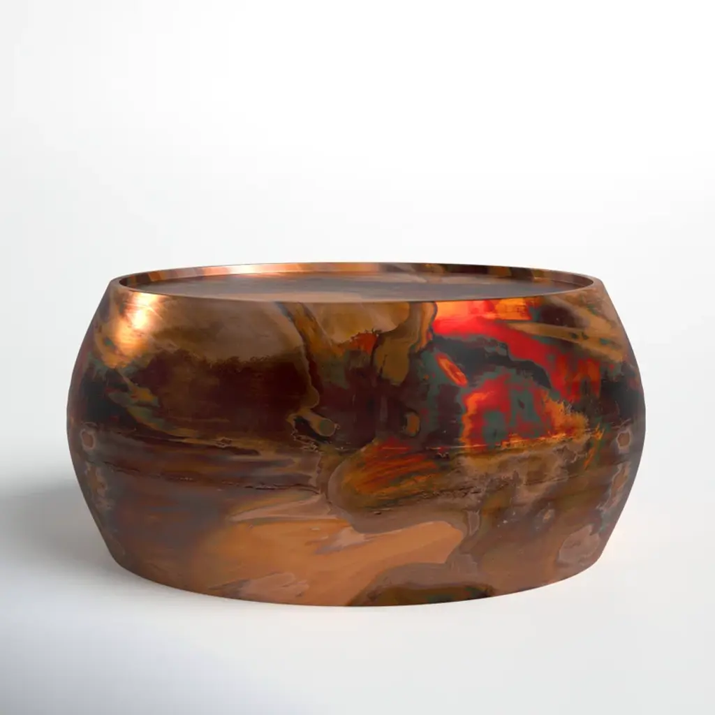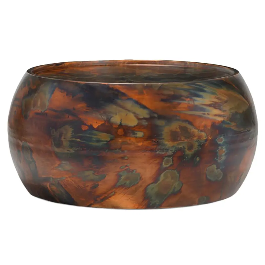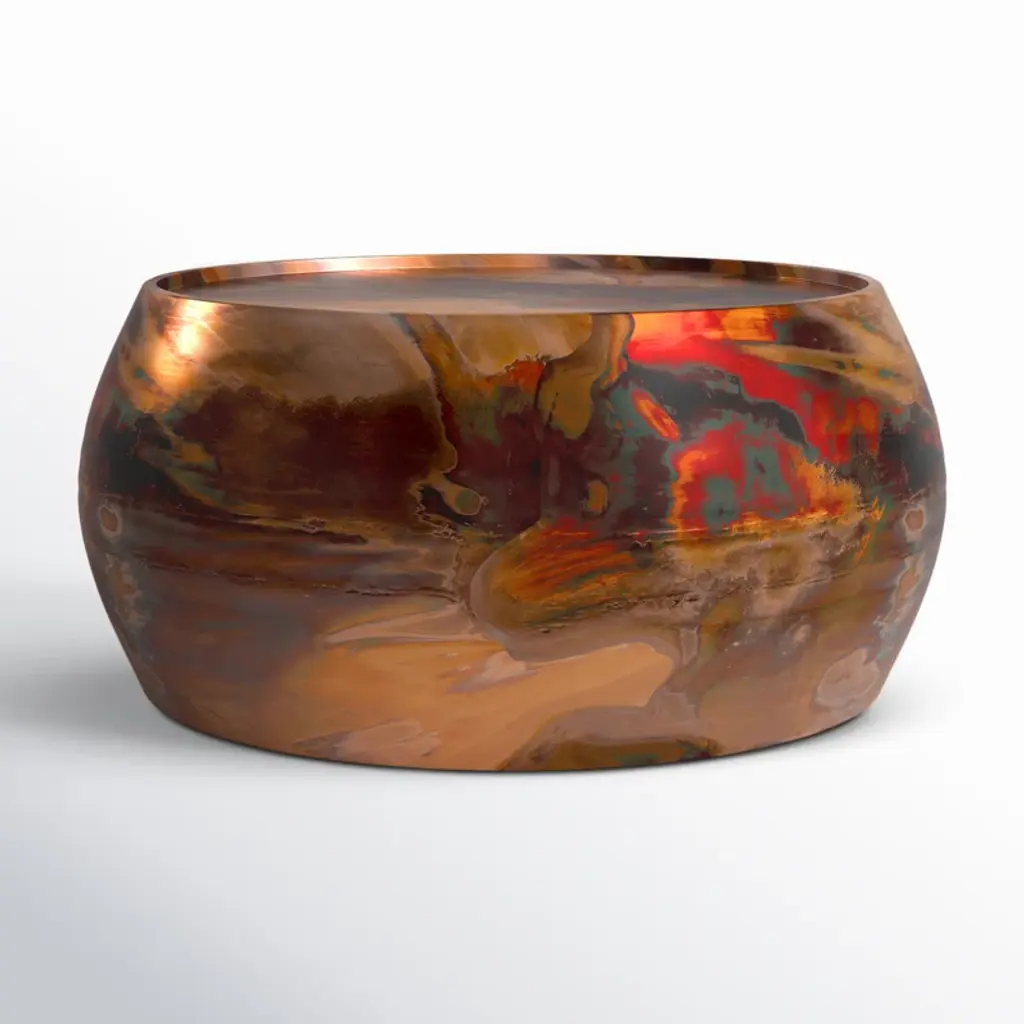 This voluminous coffee table is made of mild steel and finished in dark antique brass.