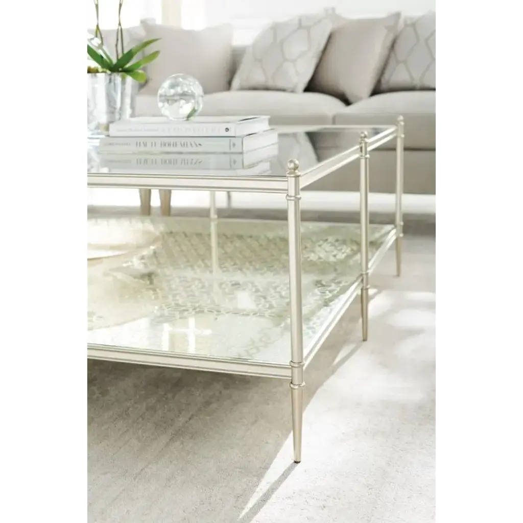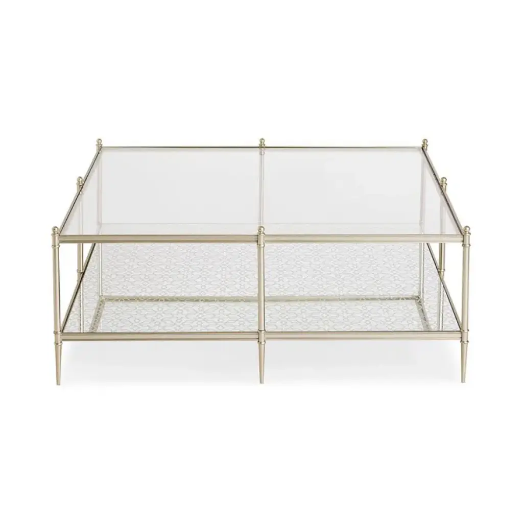 Worthy of a second look, the beauty of this cocktail table will surely prompt a double take. Its classic square shape is ideal for anchoring your conversation area while the exquisite metal frame finished in Neutral Metallic adds an element of fashion to the room. A glass top reveals the beautiful design below and is perfect for styling with your favorite design books and treasures. Generously sized and finished to perfection, this refreshingly updated table is impressive from every angle.