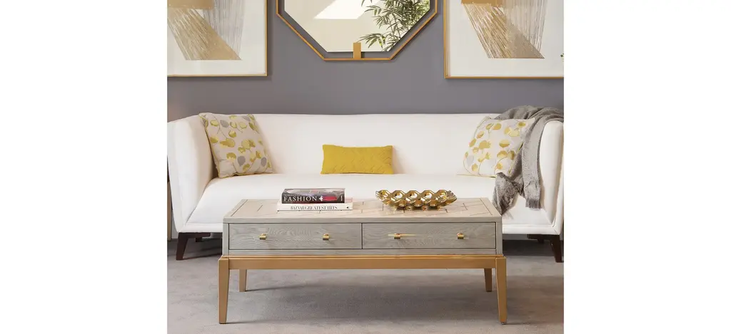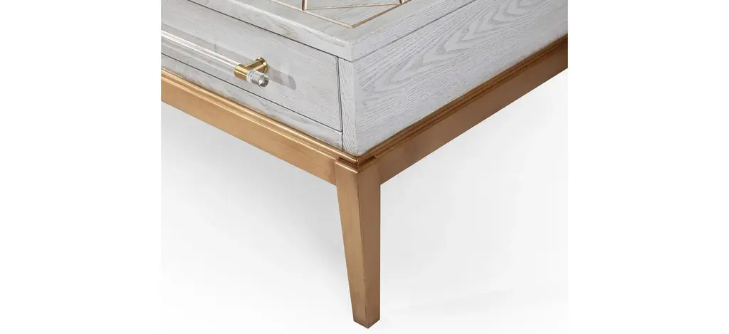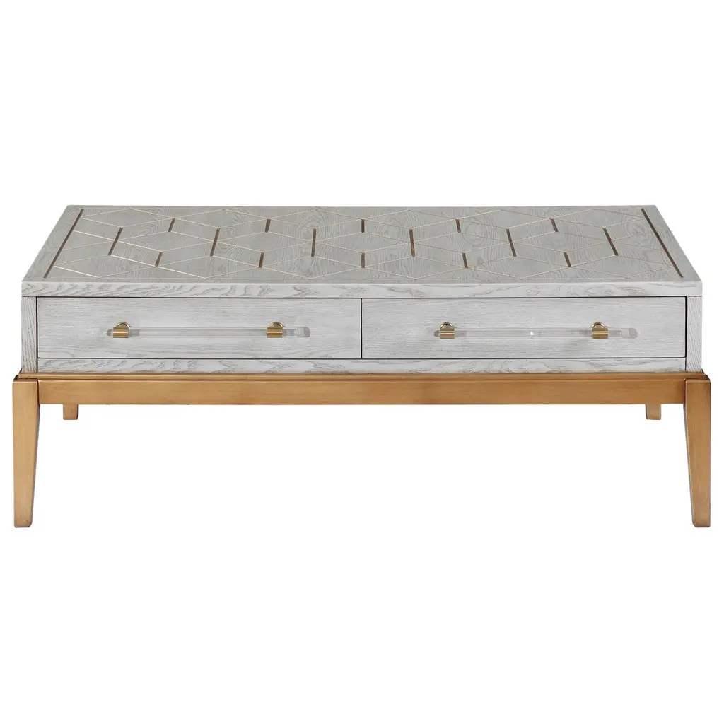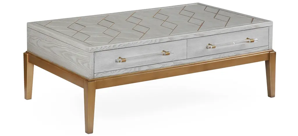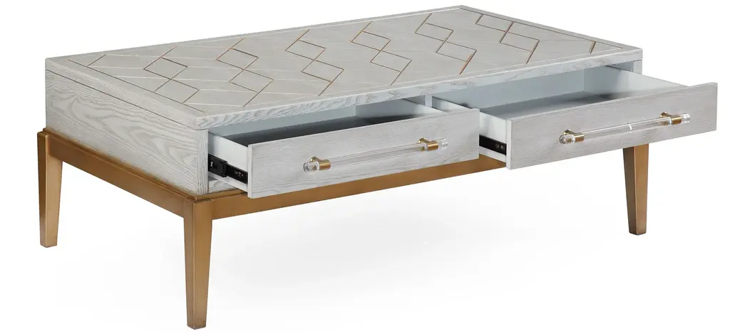 The Perrine Cocktail Table will make the perfect centerpiece for your living room. The gold legs pop against the soft graphite gray tabletop. The top is accented with antique gold geometric inlay design, and custom acrylic hardware for the two draw pulls.