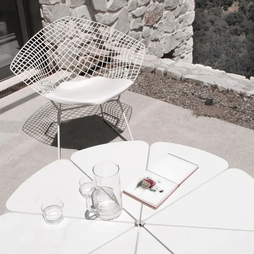 Richard Schultz cites Queen Anne's Lace as his inspiration for this delicate outdoor table with its flower-like top sprouting from the elegant pedestal base. Each "petal" expands and contracts independently, ensuring stability in changing weather.FEATURESThe Petal Table was designed to accompany the Bertoia Chairs that Harry Bertoia designed for Knoll. The tops on these tables are made of eight petals, which are mounted on a beautifully crafted cast aluminum spider. Each cluster of flowers is supported on its own stem. By making a table in this manner there is no need for a ring support, and each petal is independent which allows the table to expand and contract with the weather.CONSTRUCTIONWhite Petals: Machined High Density Polyurethane.Top spider: Powder Coated Cast Aluminum.Stem: Powder Coated Stainless Steel.Base: Powder Coated Cast Aluminum.Glides: Molded Nylon.FINISHESWhite petals with white stem.