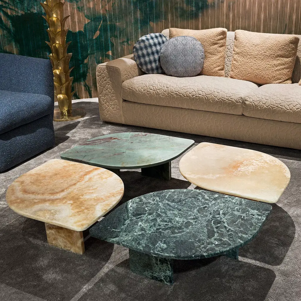 Romantically inspired by a petal, a shaped top with tapered extremities lends this coffee table its delicate allure. Unrepeatable and unpredictable traceries owed to the exclusive use of prized Honey Onyx marble invite the eye to linger on new details each time. Multiple enthralling arrangements can be displayed in pairs in different marble options.