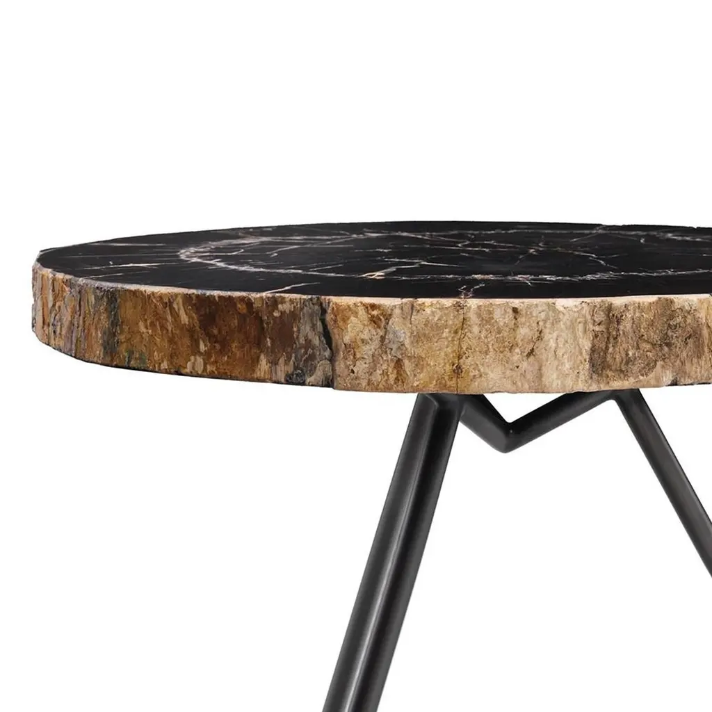 Coffee Table Petrified Wood Dark Slices Set of 3.On bronze finish base. Each top is unique andexceptional piece from Indonesia.Measure: A/L 64 x D 50 x H 50 cm.B/L 64 x D 50 x H 43cm.C/L 64 x D 50 x H 36 cm.