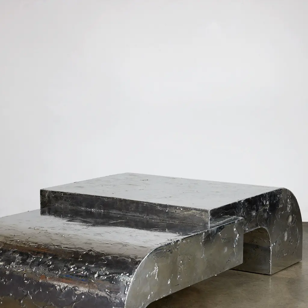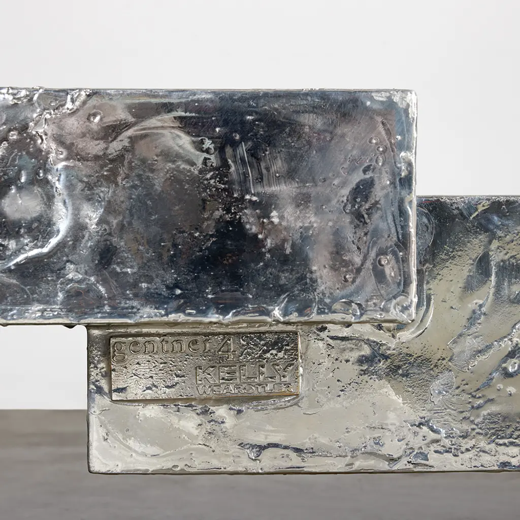 Embracing the unique qualities of lustrous pewter, the Pewter Coffee Table transcends mere functionality into a unique design statement. No longer confined to its solid state, pewter is melted into liquid form and expertly hand coated onto an architectural steel structure, offering a harmonious blend of strength and elegance. Highlighting the fluid nature of distinctive metal alloy with its intricate patterns and undulating contours, each table design exudes an aura of individuality and exclusivity, ensuring that it becomes the focal point of any living room interior. Christopher Gentner, with a BFA in metalsmithing from the Cleveland Institute of Art and apprenticeships under sculptors and jewelers, together with dedication to craft, quickly developed his reputation nationally as a foremost authority of metal fabrication and furniture. One of his crowning achievements was the re-creation and fabrication of the Frank Lloyd Wright Robie House gates. These unique experiences are the foundation of his design philosophy which he employs in his own line of furniture, lighting, and objects.