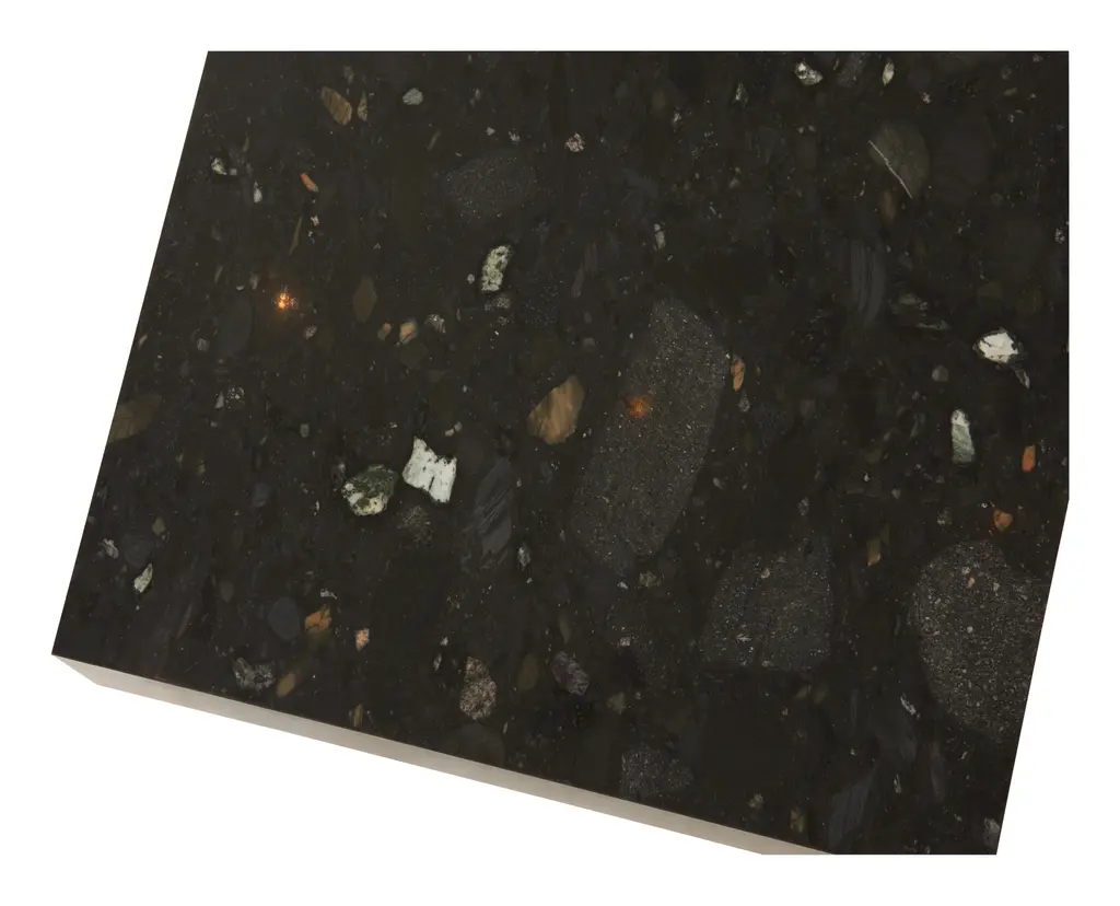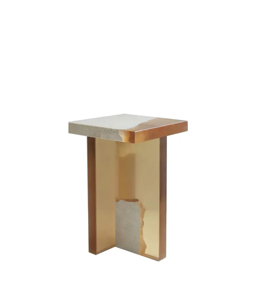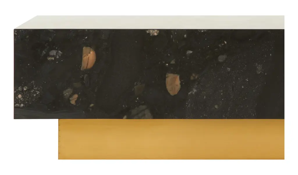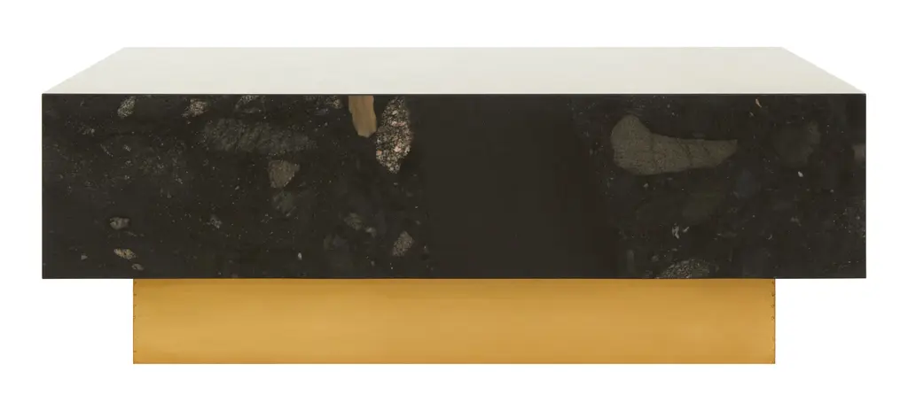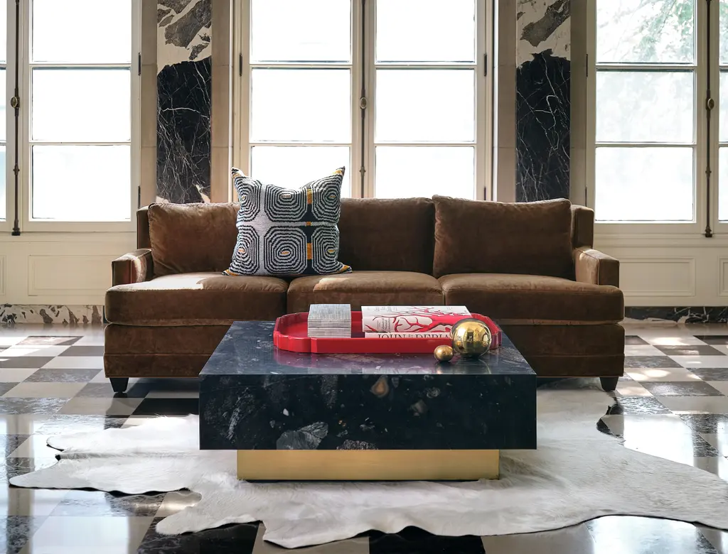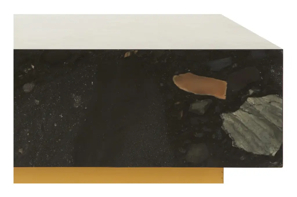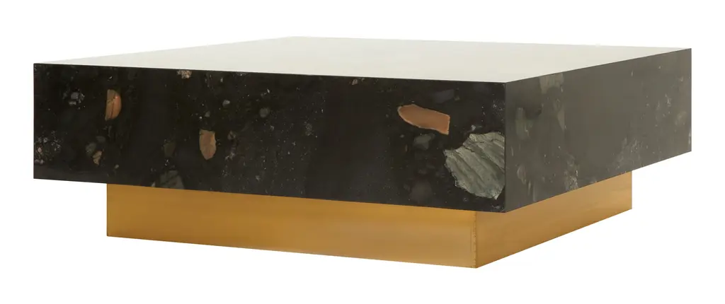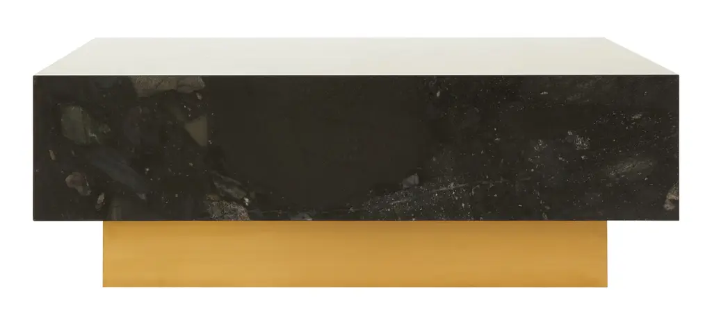 Anchor your seating area with our eye-catching Phoenix Coffee Table. Simple yet striking in design, this piece features a blocky, rectangular tabletop crafted from black marble with splashes of unique brown and cream veining. This tabletop rests on a recessed plinth base that’s clad in brass foil sheets held in place with tiny tack details for a bit of shine. The epitome of cool, we especially love our statement-making Phoenix in a moody modern living room. •black marble •brown and cream veining •fibreboard base•brass foil finish•tack details •each is unique; variations in marble color and veining should be expected Dimensions•40.25"W x 40.25"D x 14.25"H