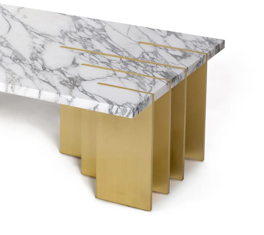 Pianist Calacatta Marble Coffee Table by InsidherLandDimensions: D 75 x W 130 x H 38 cm.Materials: Calacatta marble, brushed brass.115 kg.Other marbles are available.The Pianist coffee table, doesn't represent the piano but the hands of the artist, vehicle of technique and emotion. The brass blades design the shape of the four longest fingers that, on a keyboard in marble, release a melody hidden within the musical notes.Created by Architect Joana Santos Barbosa in 2012, InsidherLand is a Portuguese brand of exclusive design. Drawn with the signature of the creator, the impressive range of contemporary luxury furniture, lighting, upholstery and accessories are connected to her personal memories and have been highlighted for their innovative and soulful designs.Joana explores several influences from travels around the world to define her own Land as a place that allows her to translate her perceptions into objects of art.The essence of InsidherLand is presented by two inspiring collections. Beyond Memory Collection is deeply influenced by organic forms of nature, legends and traditional cultures, as for the Identity Collection is molded by forms of Architecture and Art. Both collections are designed as a dialog in which nature meets strong architectural lines to create relaxed and sophisticated interiors surrounded by natural materials and meaningful art pieces.Being positioned in strategic markets of high-end luxury decoration, InsidherLand team is proud of working with the best architects and interior design studios from all over the world who seek for handmade exclusive objects that arouse emotions and stand out in exquisite spaces.We are dedicated with love and enthusiasm into every creation to surprise a sensitive but demanding public. Using the expertise of traditional craft techniques, all creations are made by the hands of Portuguese master craftsmen and jewelers who wisely sculpt them in noble materials, finalizing every detail with elegance and perfection.