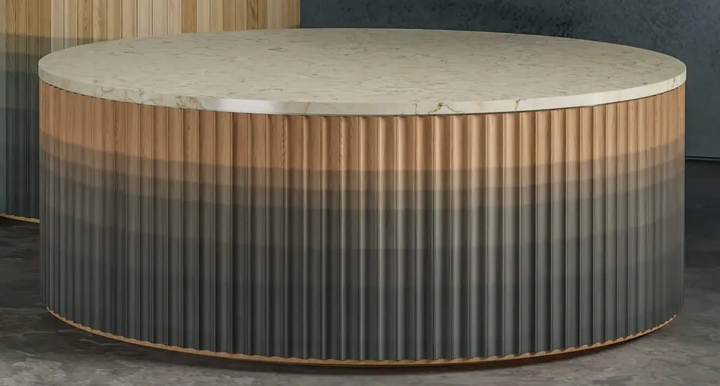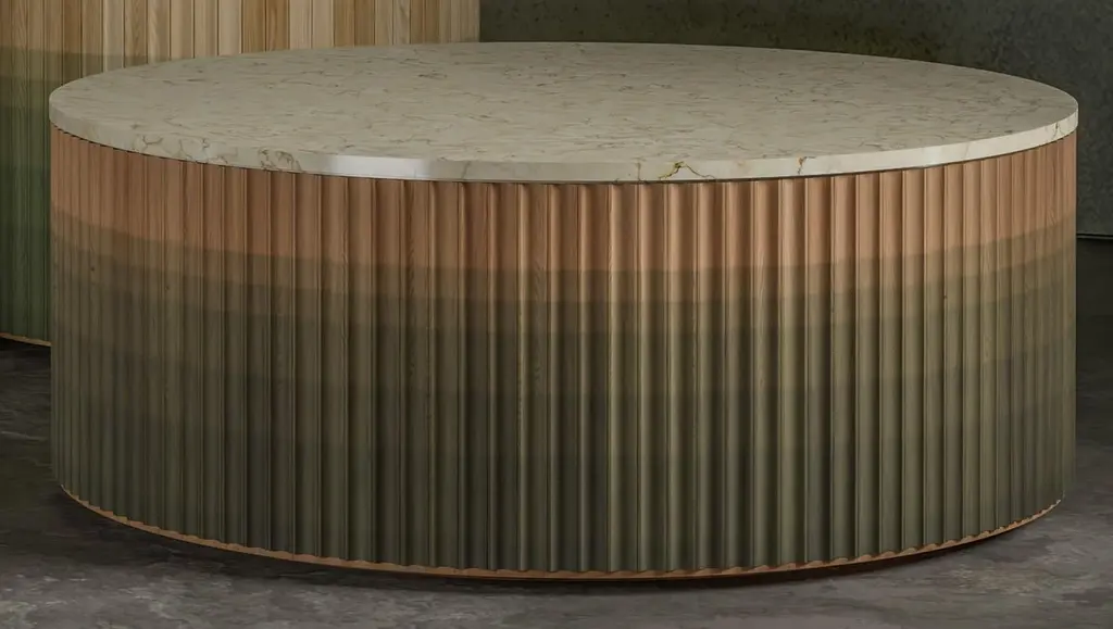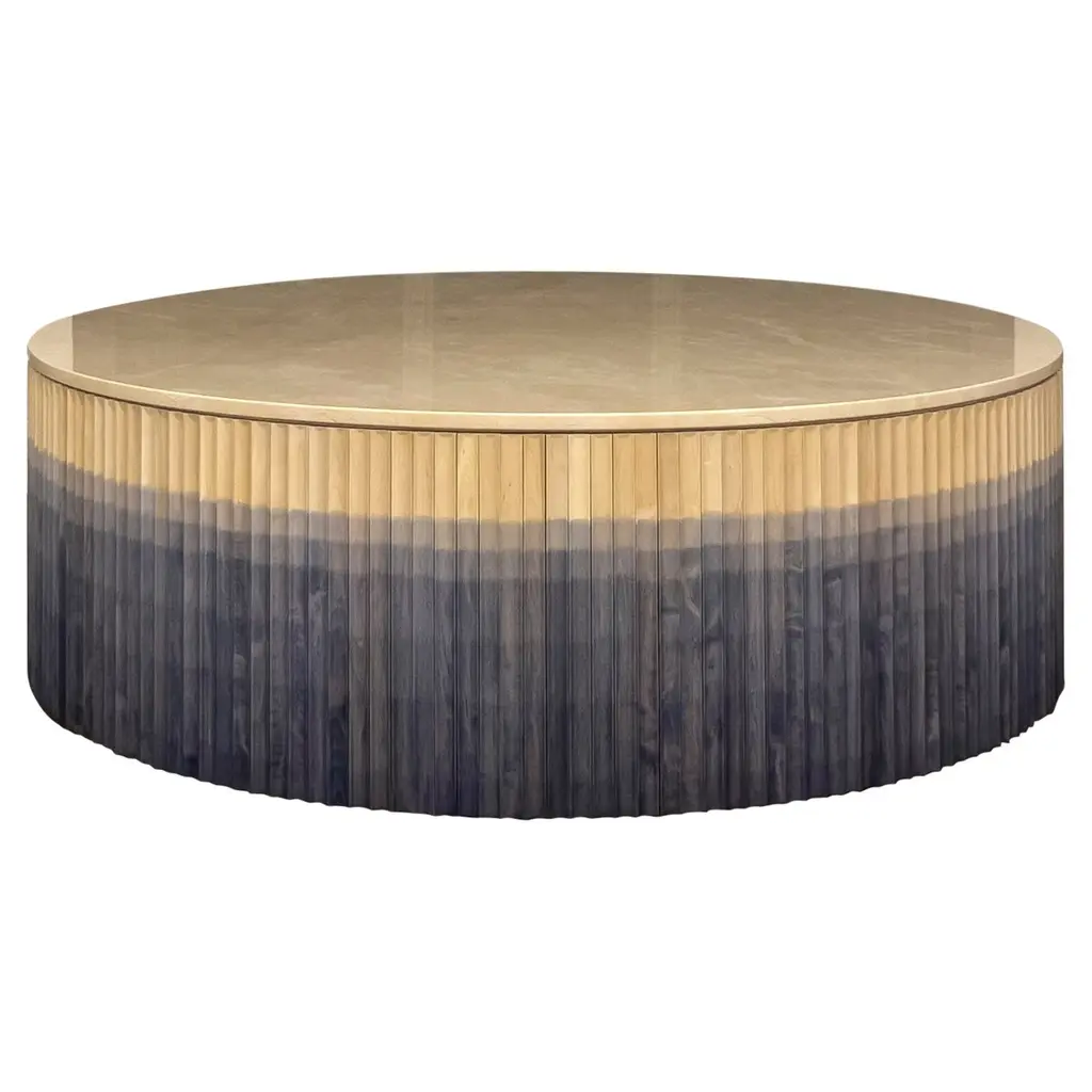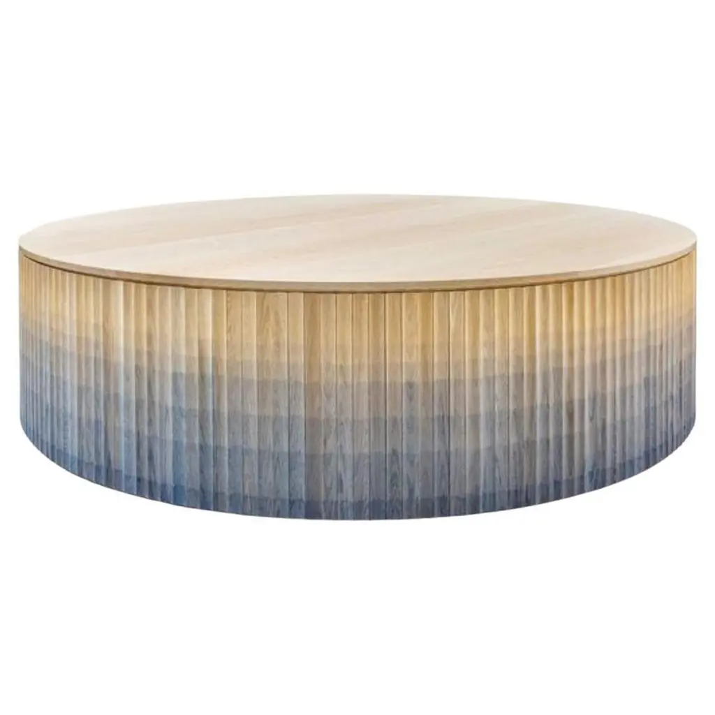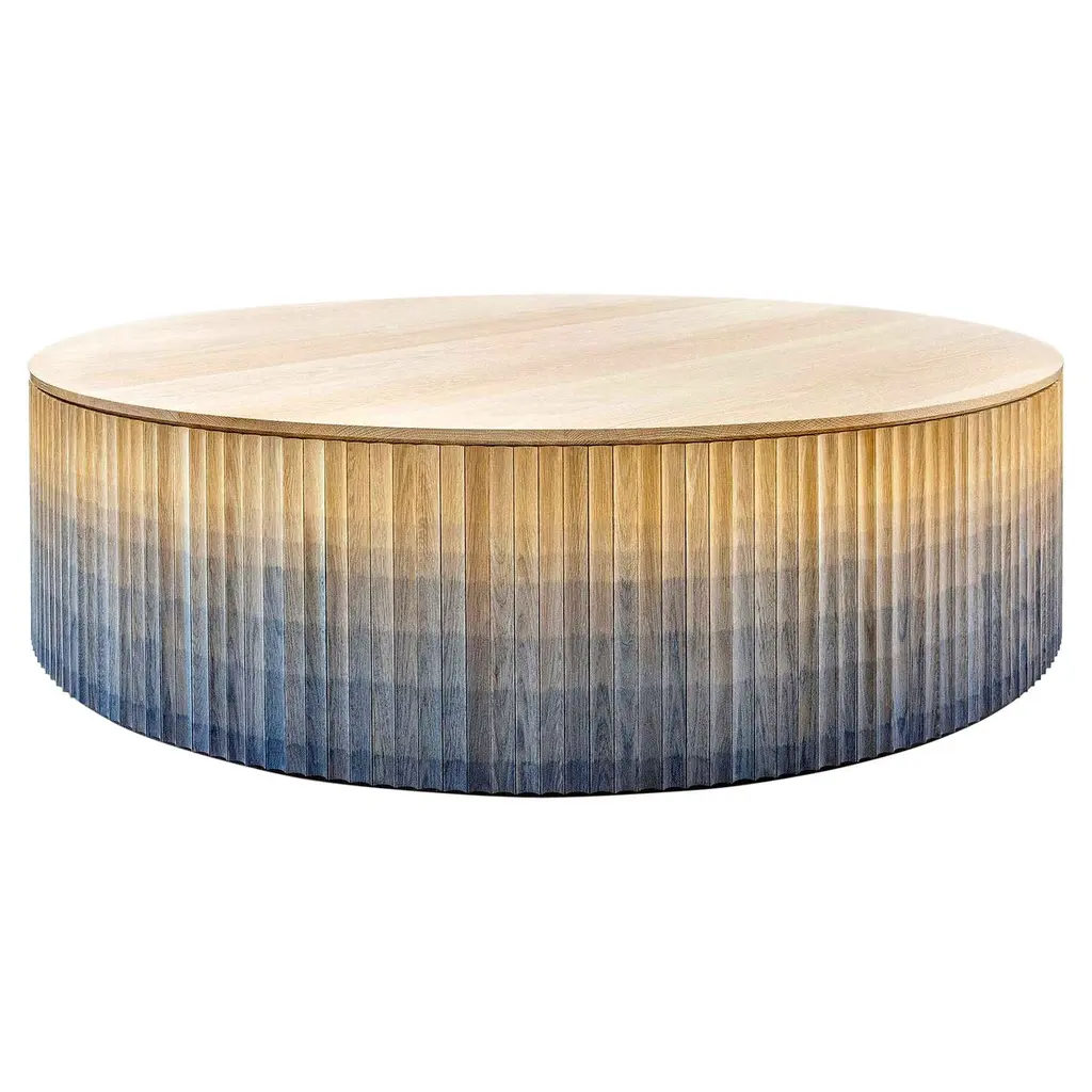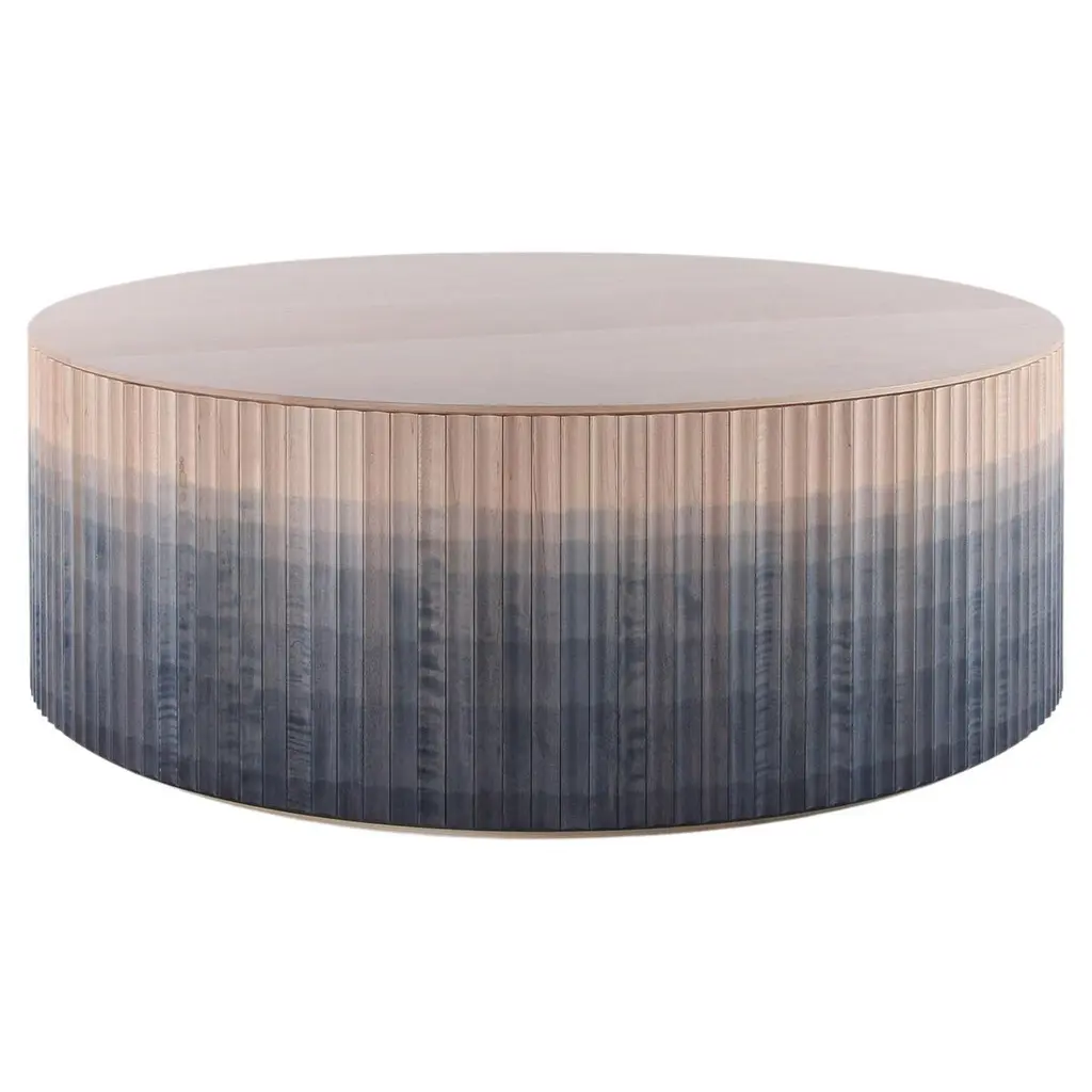 Pilar coffee table large by INDO-One of a kindDimensions: Ø 132.1 x H 38.1 cm Materials: Oak (Ombre finishes in Celadon green, Cobalt blue and copper red), Stone topAlso available in other materials.Each piece is carefully handcrafted by our team using natural materials and traditional processes. Slight variations may occur. INDO- is an award winning interdisciplinary design studio based in Providence, RI. Founded in 2018 by Urvi Sharma and Manan Narang - both grew up in New Delhi and met at the Rhode Island School of Design - INDO- is a product of experiencing both places and cultures. Using a blend of craft and narrative in our creative process, we aim to share the rich cultural and historical identity we bring with us as Indian designers in the rapidly changing landscape of American design. With a focus on re-contextualizing traditional techniques from different disciplines of art and craft into our work, INDO- creates contemporary objects that celebrate the handmade and acknowledge the people and places that inspired them.