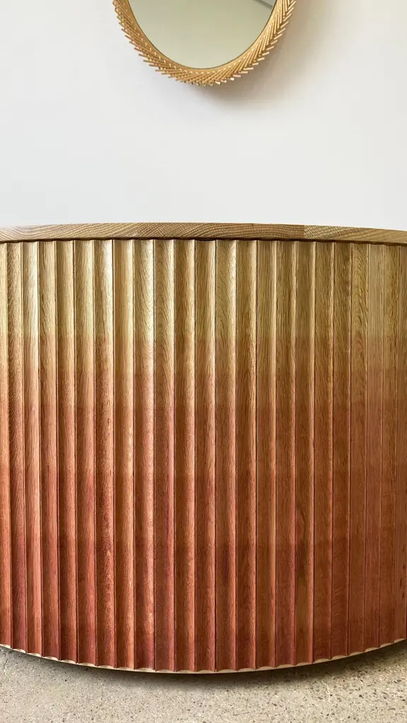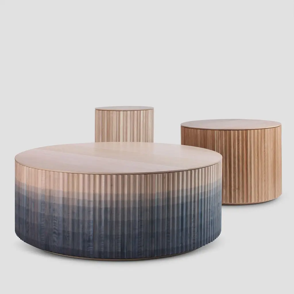 Made of solid American hardwoods, the Pilar Coffee, Occasional and End Tables provide both functionality and character in spaces such as a living room or hotel/office lobbies.With the ability to work in clusters or by themselves, they serve a wide range of demands, from accent to statement pieces. Apart from the standard colors, they can be made in a range of customized colors to stay in line with a brand identity and stone tops for high traffic zones. Inspired by our travels to Barcelona, the intense, bold use of color by Gaudi in his architectural mosaics alongside the rich, earthy glazes of Catalan ceramics, we aim to create the same feeling of warmth and wonder through the pieces in the Pilar Collection. From afar, the layered hues mimic a mosaic, with each tile of color representing a piece of the complete picture. Recontextualizing the process of dipping and layering glazes on ceramics alongside the tactility of its fluted wooden surface, the Pilar Collection invites you to come closer, discovering moments of color and intensity particular to each flute as they create a constant dialogue of light and shadow. The Pilar Collection is a nod to simple, functional, contemporary design with a beauty inherent in the handmade.