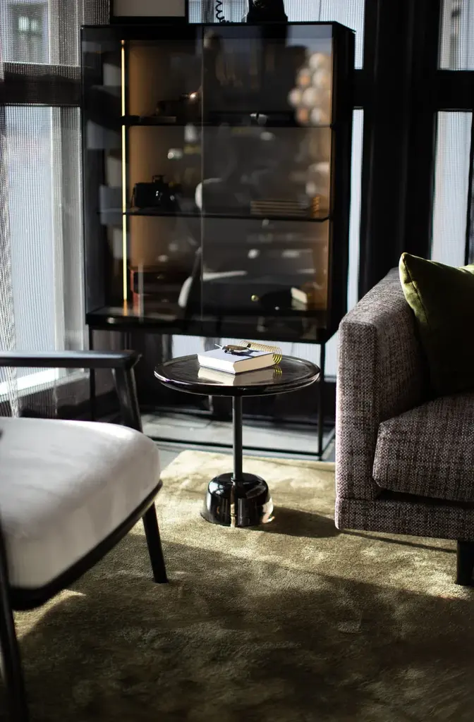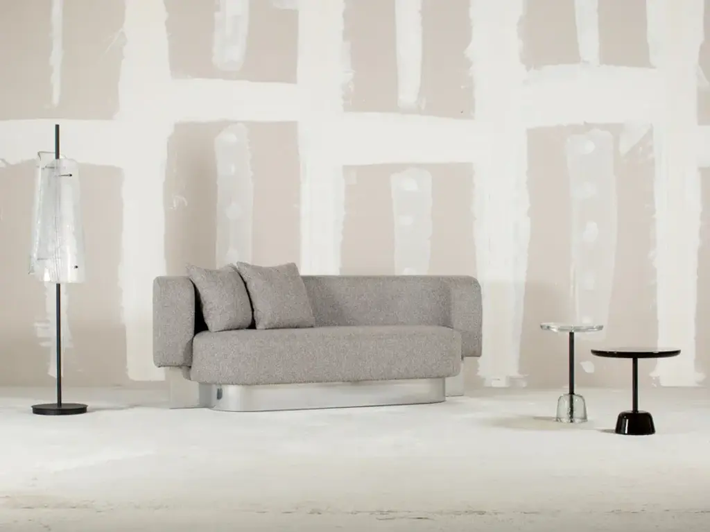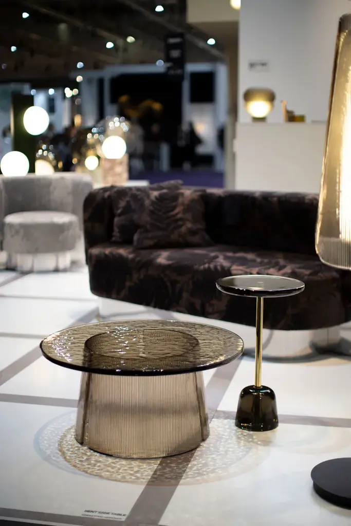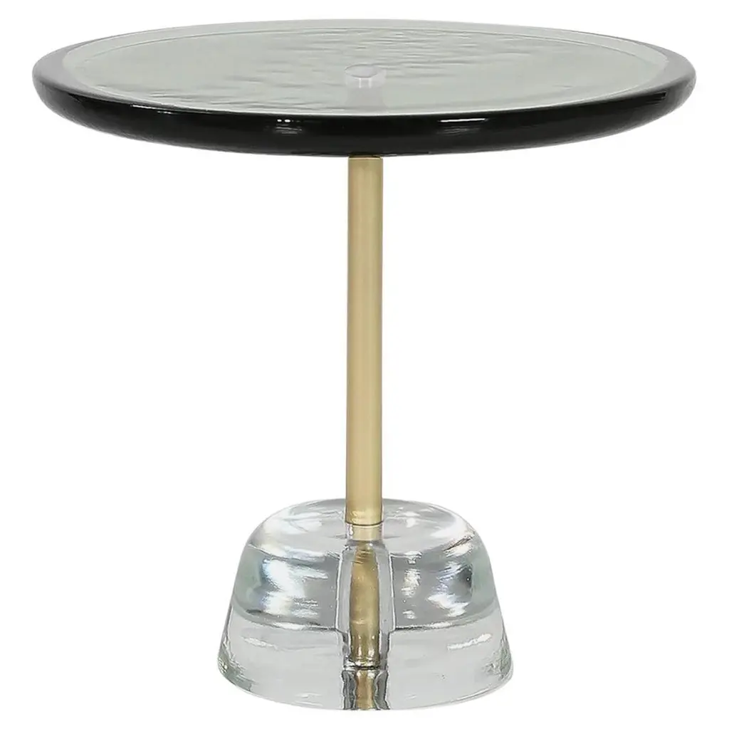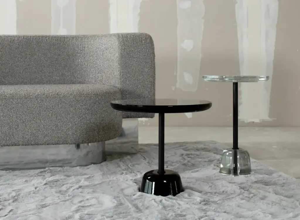 Sebastian Herkner’s distinctively tall, skinny side table series pina is inspired by the abstract turns and twists of the famous Pina Bausch dance theatre. The basic figurine with base, rod and top, all made of casted glass, shines in different combinations of green, corn yellow, aqua blue, light grey and transparent.The side tables are produced from casted glass with rods from brass and steel. Bubbles, streaks and other variations in size and color are part of the production process, and not defects of the design or production. The pina series is made up of two sizes, low and high, and available in a range of color combinations.