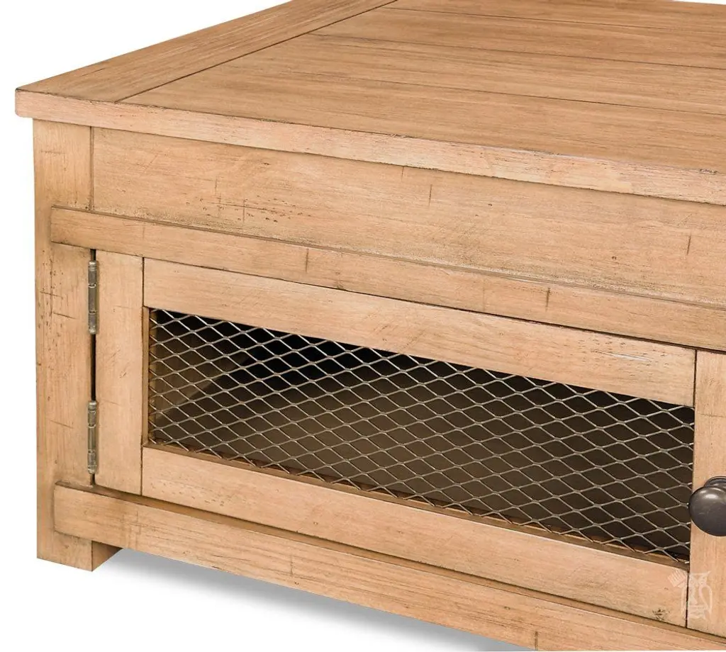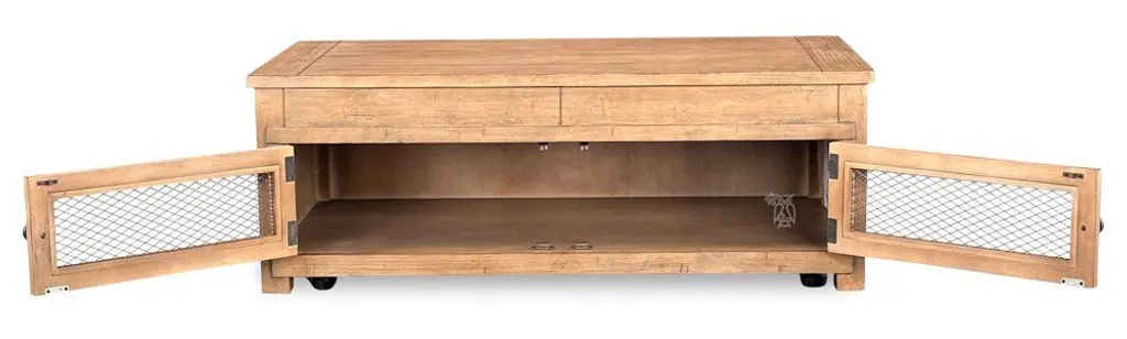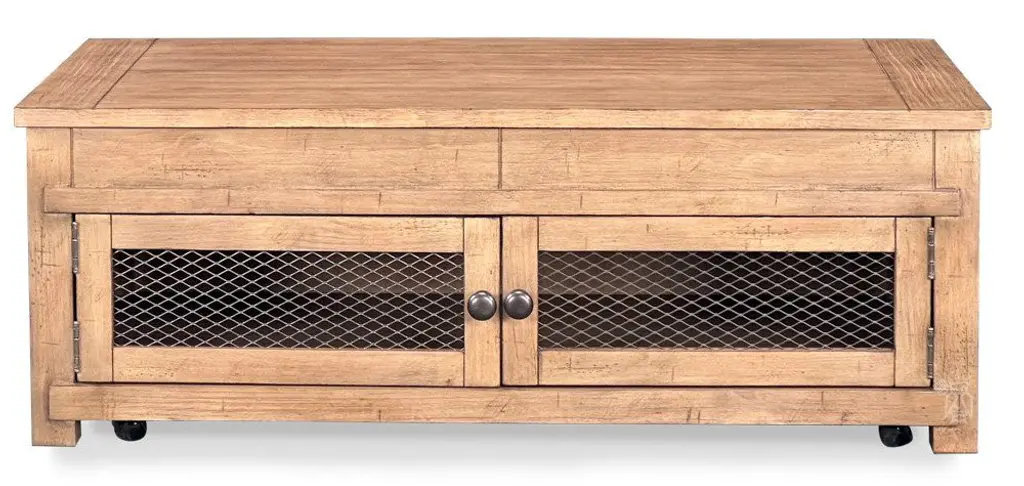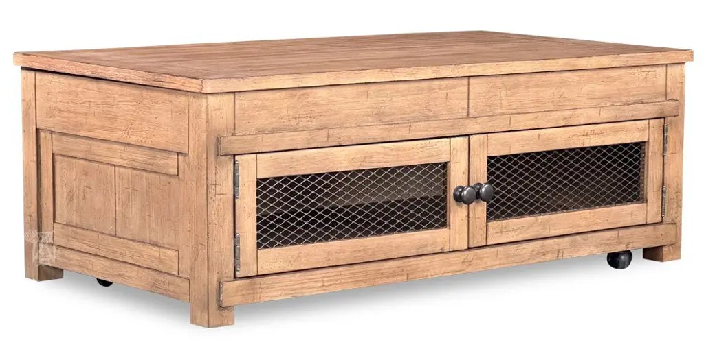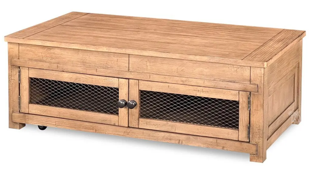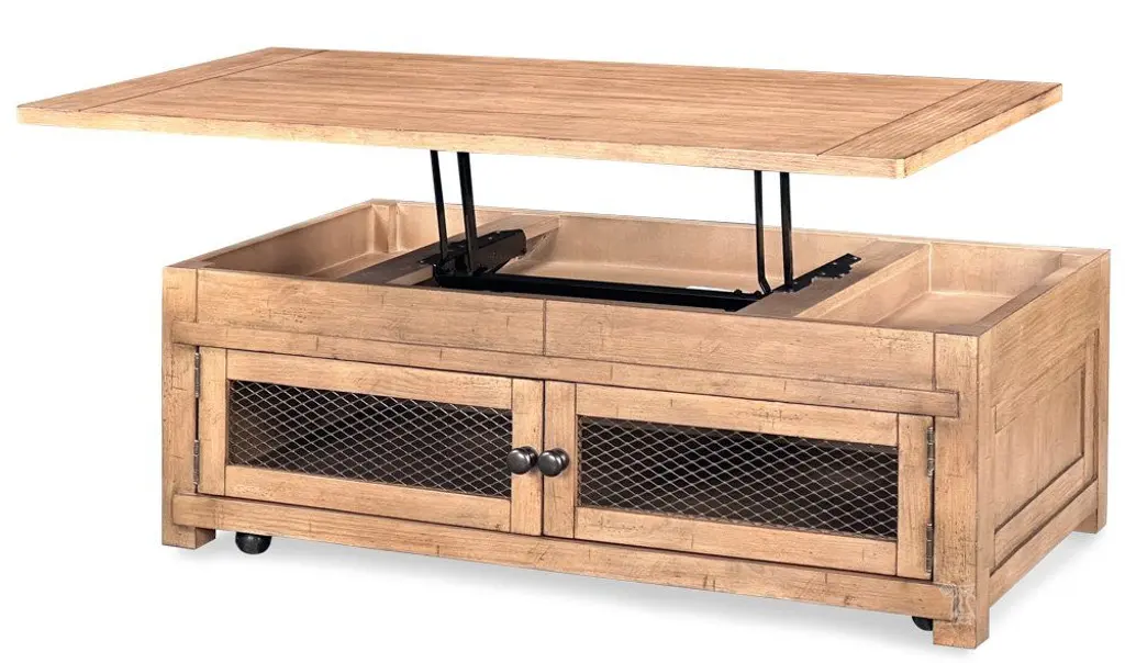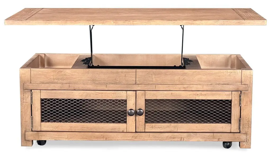 Pinebrook Ridge Lift Top Coffee Table in Weathered Toffee Finish. This cocktail table features a lift mechanism to use as a desk, game table or eating table. There are four castors to move the table in any direction. This is a great feature to use with reclining sofas and chairs. There is ample storage behind the mesh doors. You can store smaller items such as remotes, coasters or dog treats directly under the top. Item Features: Features a Lift-Top Storage Compartments Beneath the Lift-Top Planked Top & End Panels 2 Wood Framed Doors w/ Wire Mesh Panels Casters Ensure Easy Mobility When Needed Bronze Knob Hardware Pine solids and veneersᅠ Get cozy and create an inviting atmosphere in your home with the Pinebrook Ridge lift top cocktail table. Crafted with excellence using pine solids and veneers, this piece features a Weathered Toffee finish. The top is highlighted with planked panels and butcher block style ends. The top lifts and extends to reveal storage compartments beneath. There are two wood framed doors accented with wire mesh panels and bronze knob hardware that open to reveal another large storage compartment. With casters, this cocktail table is easily mobile when needed. The Pinebrook Ridge lift top cocktail table strikes the perfect balance of life on the coast and a comfy home tucked away in the hills. Fully assembled. Manufacturer: Liberty Furniture.